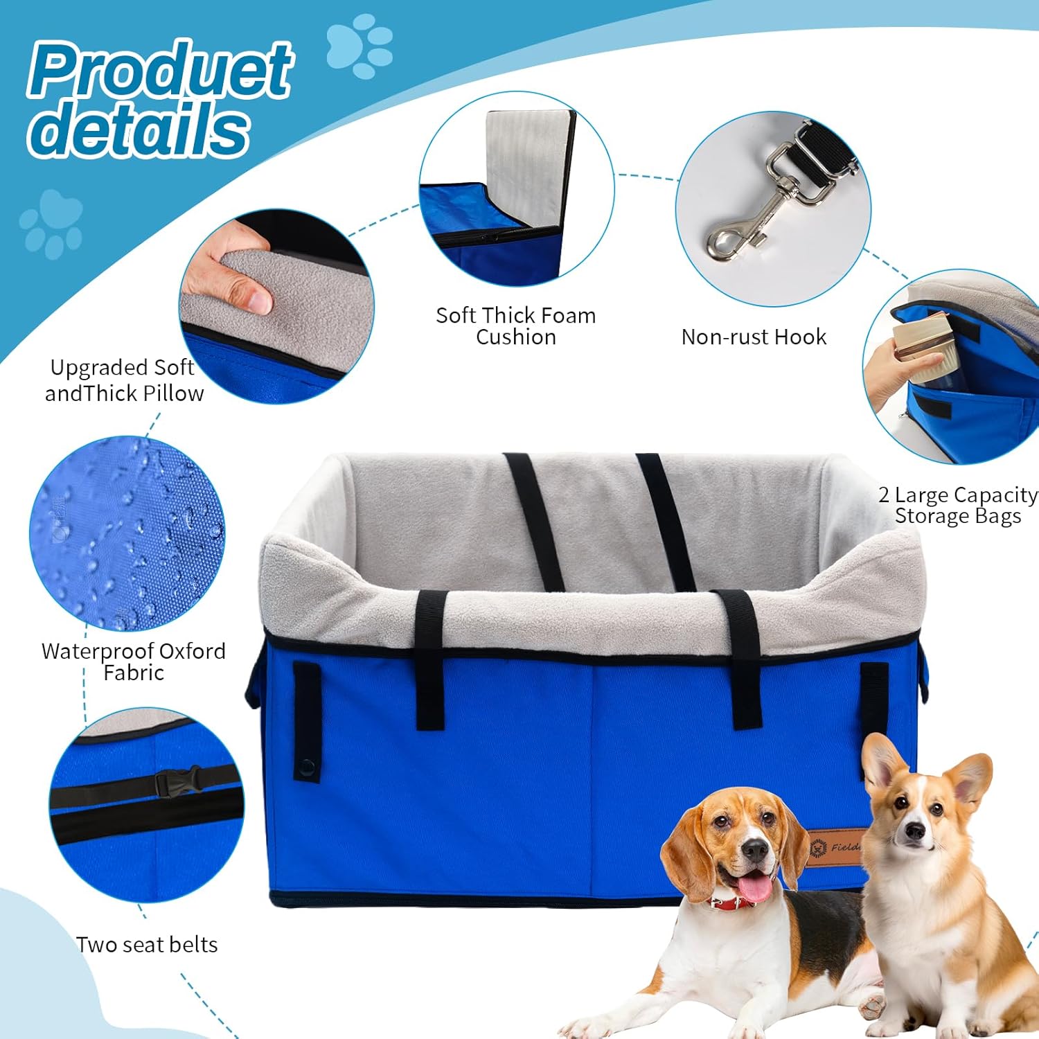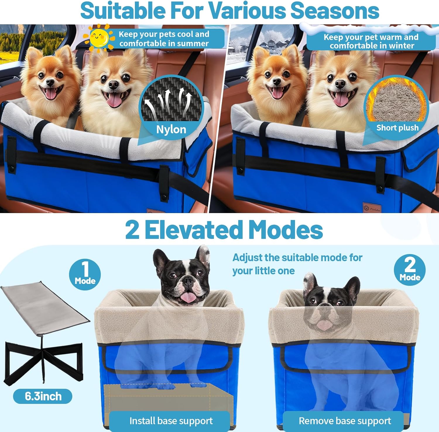 【Upgraded Safety & Comfort】1.Fielda Pet Booster Seat bottom support has been reinforced to effectively avoid rollover situations.2. Patented buckle and adjustable clip-on leash prevent pets from jumping out.3. 0.2 inches of knitted cotton has been added to the sidewalls of the pet seat with thickened plush lining to increase the comfort for pets to use it. 4. Two safety belts for double protection, making the dog seat more firmly and stably tied to the car seat.