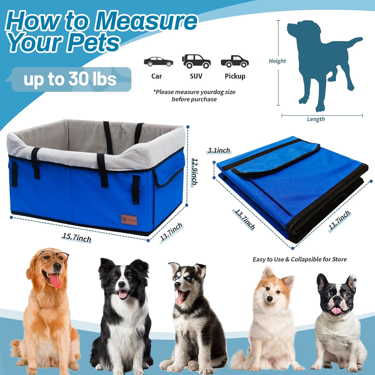 【Ideal Size】 The large pet car seat measures 23″L x 16.5″W x 13″H, suitable for medium (or large) dogs weighing no more than 55 lbs, and can also accommodate up to 2 small pets. Before purchasing, please check the size of your puppy to find the right seat size.