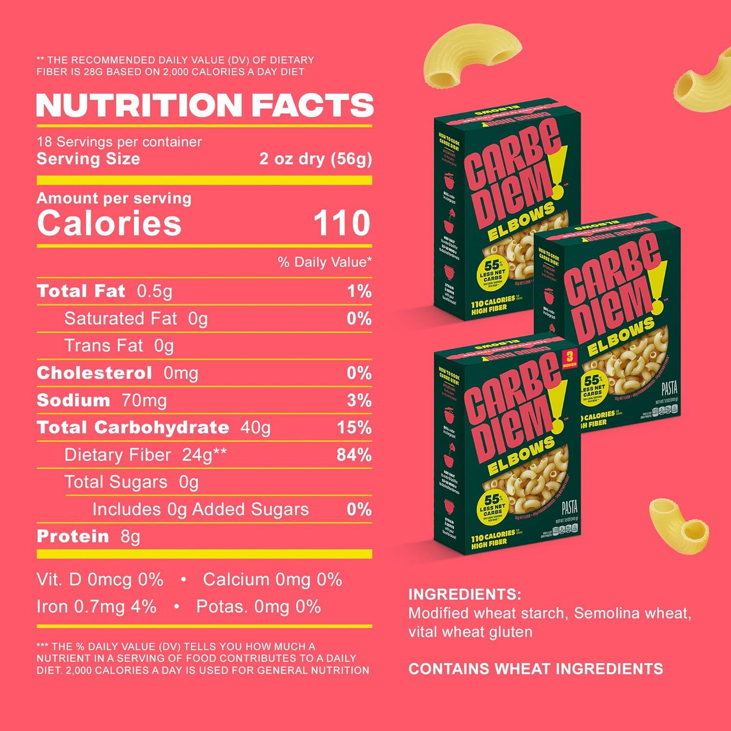 Carbe Diem!, Elbows, Lower Net Carb Pasta with Traditional Flavor & Texture, Pasta Re-Imagined for Healthy Lifestyles