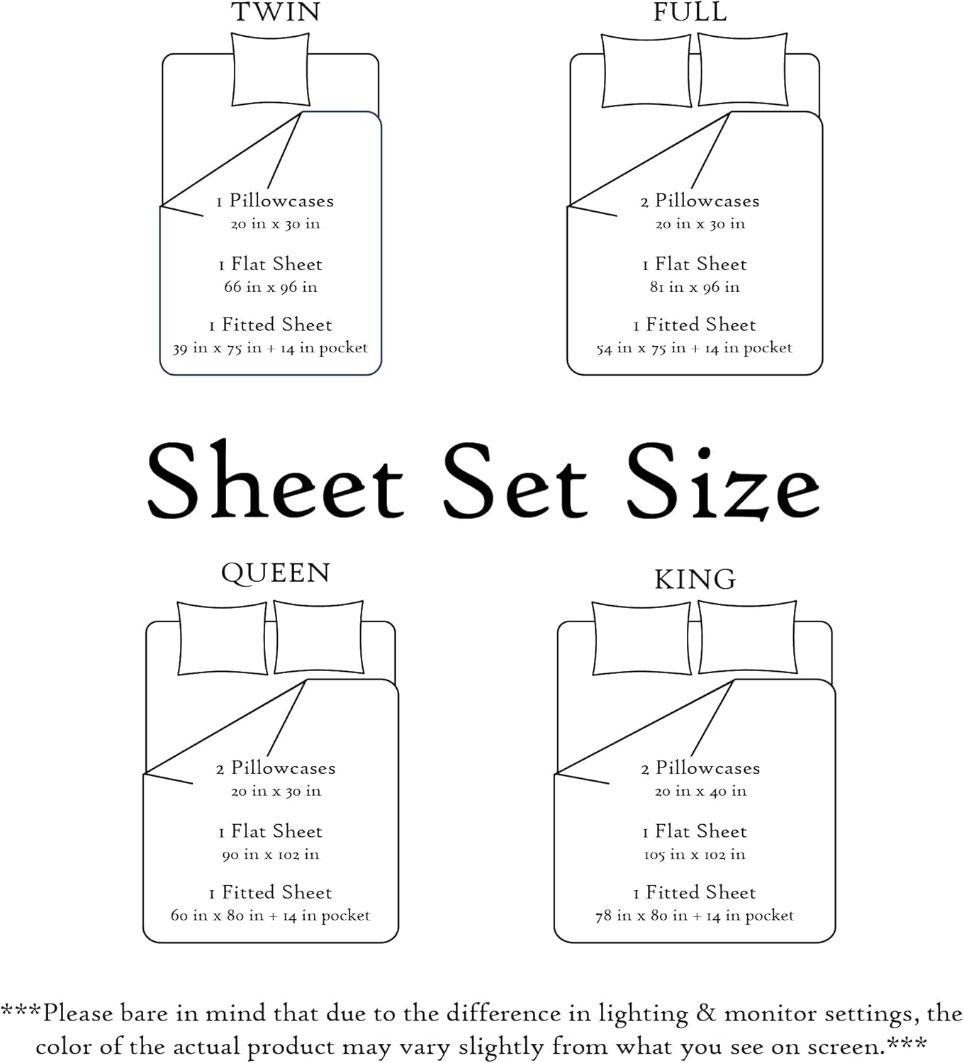 WHAT’S INCLUDED – King Set Includes: 1 Fitted Sheet 78″ x 80″, 1 Flat Sheet 102″ x 105″, 2 Pillowcases 20″ x 40″.