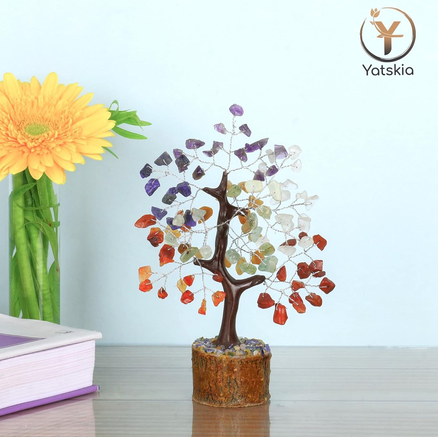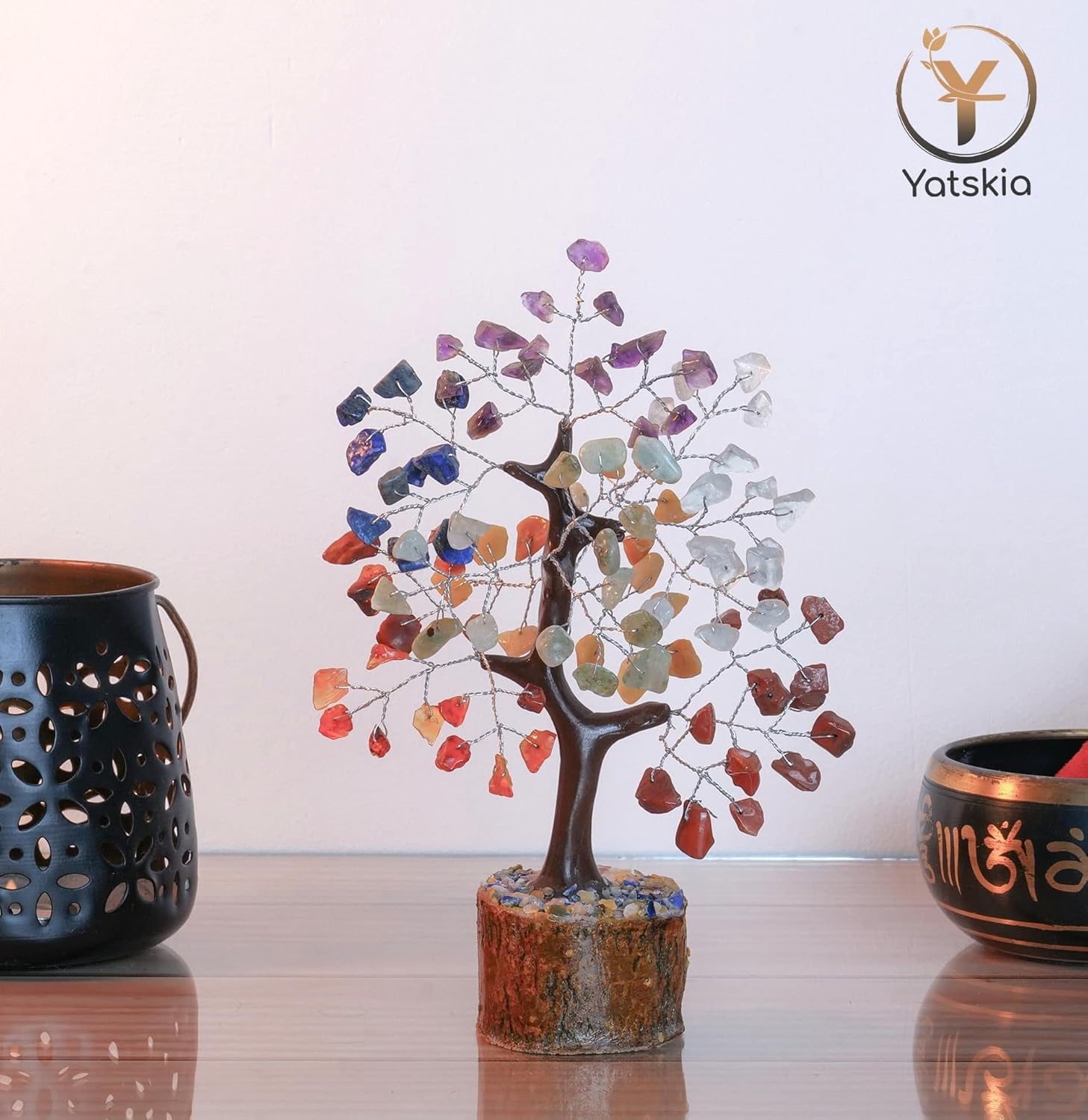 crystal tree with natural wooden base inspired from nature, this beautifully handmade chakra crystal tree is crafted with a natural wooden base, silver wires and seven chakra crystals. the trunk of this tree is covered with m-seal. this elegant tree of life with its sober beauty is 7 inches in length. the good luck tree of life will not only create a space for serenity but will also enhance the home office desk decor. chakra tree for seven chakra healing – the natural stones on this crystal tree are amethyst, carnelian, red jasper, lapis lazuli, clear quartz, yellow aventurine, and the green aventurine crystal stones. these stones can heal and align your seven chakras namely root chakra, solar plexus chakra, sacral chakra, heart chakra, third eye chakra, throat chakra and crown chakra.