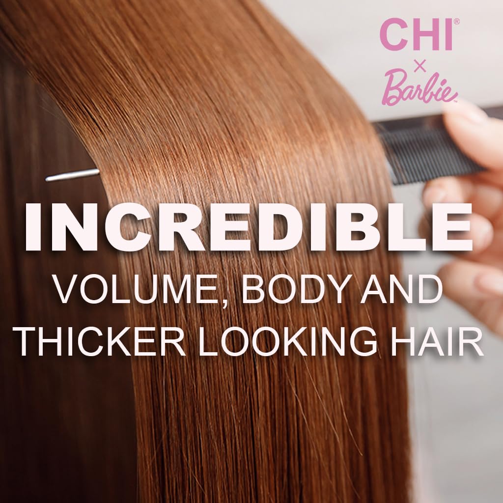 WEIGHTLESS FORMULA: The CHI x Barbie Volume Booster is weightless, while providing a flexible hold for long-lasting style with incredible shine. This product can be regenerated with heat again and again.