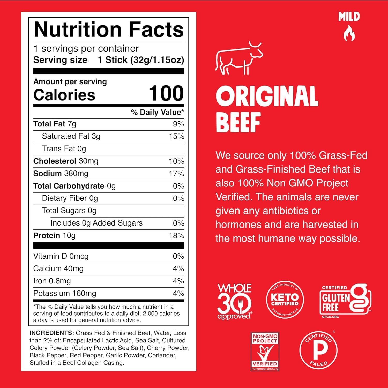 Total Snackage: Each satisfying 1.15 oz Original Beef Jerky snack stick is made with high quality, real ingredients, has 10 grams of protein, zero sugar, and just 100 calories. The perfect snack you can feel good about anytime, anywhere.