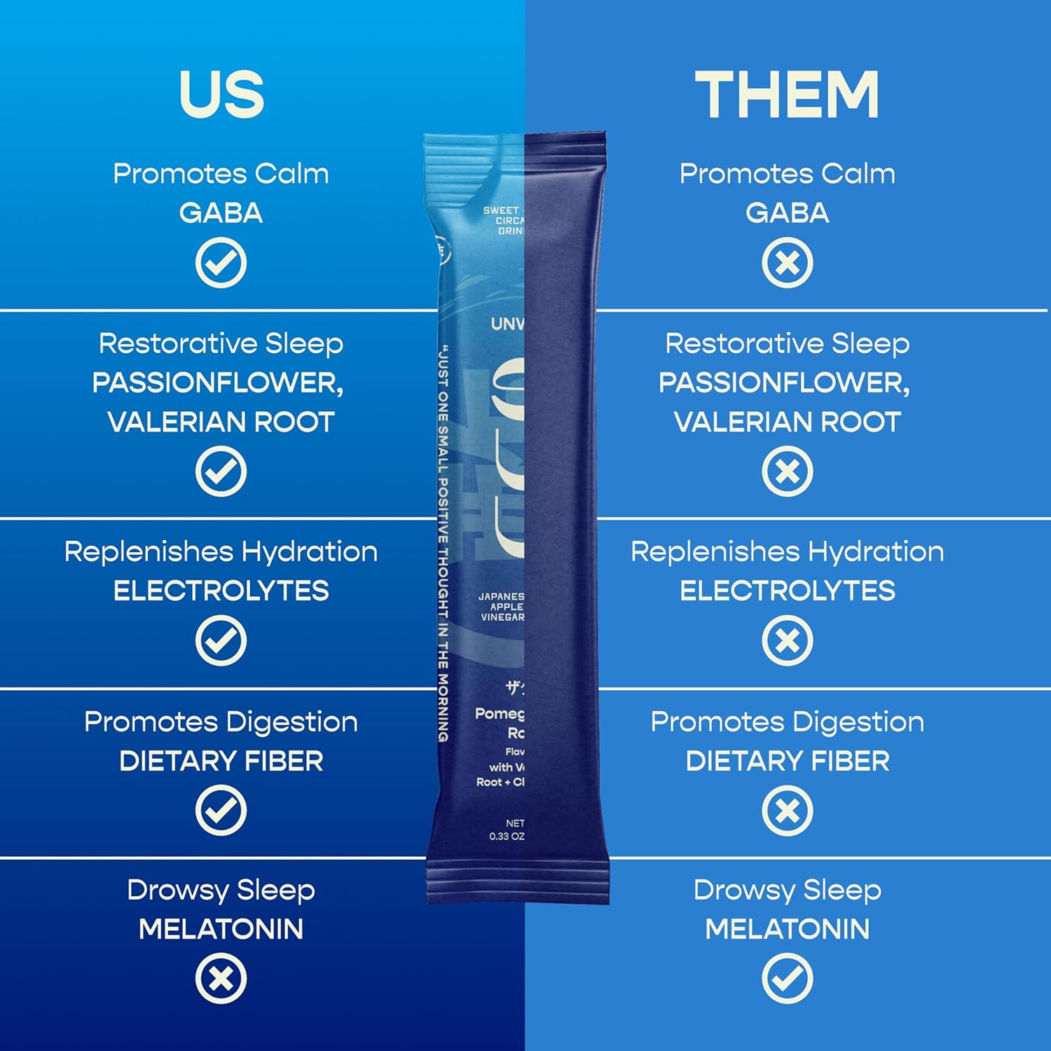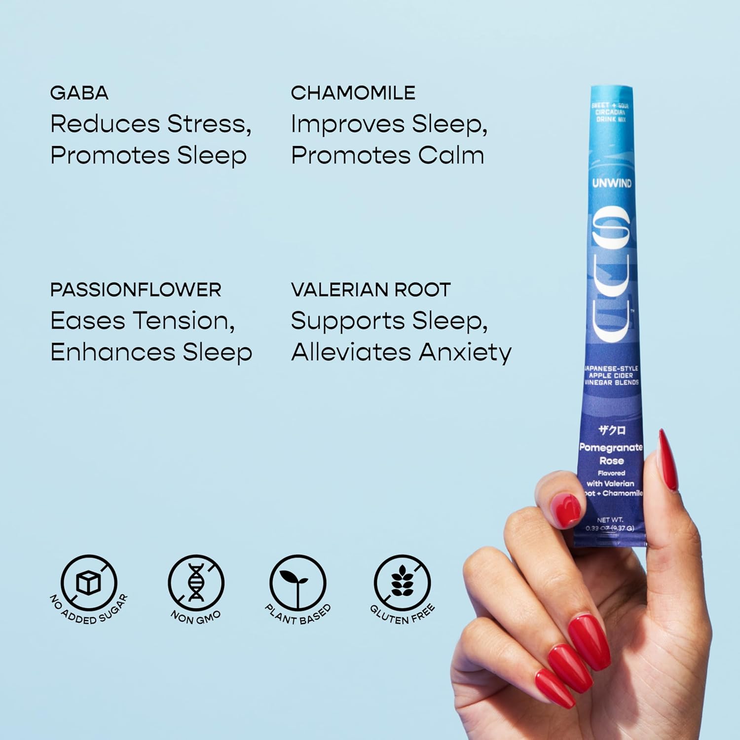 SUUâs Circadian Unwind has completely transformed my nighttime routine! These hydration packets are not only convenient but also incredibly effective at promoting relaxation and better sleep. The blend of natural ingredientsâGABA, valerian root, chamomile, and passion flowerâworks like magic, gently easing me into a restful state without any grogginess the next day.The pomegranate rose flavor is a delightful treatârefreshing and just the right balance of fruity and floral. I love that it also includes organic apple cider vinegar, giving it a healthy twist and aiding digestion before bed.The hydration aspect is a bonus I didnât realize I needed. It helps me wake up feeling refreshed and not dehydrated like I often do. Plus, itâs easy to mixâjust pour, stir, and enjoy.If youâre looking for a natural, effective way to improve your sleep and unwind at the end of the day, this product is a must-try. Itâs become a nightly staple for me, and I couldnât be happier with the results!