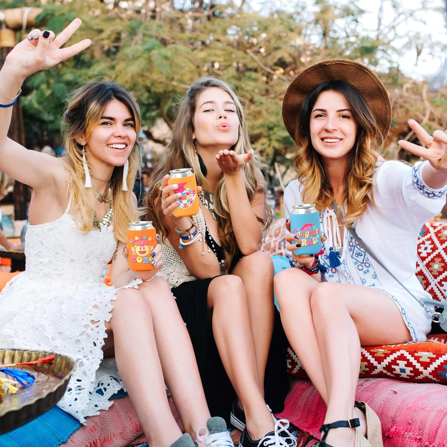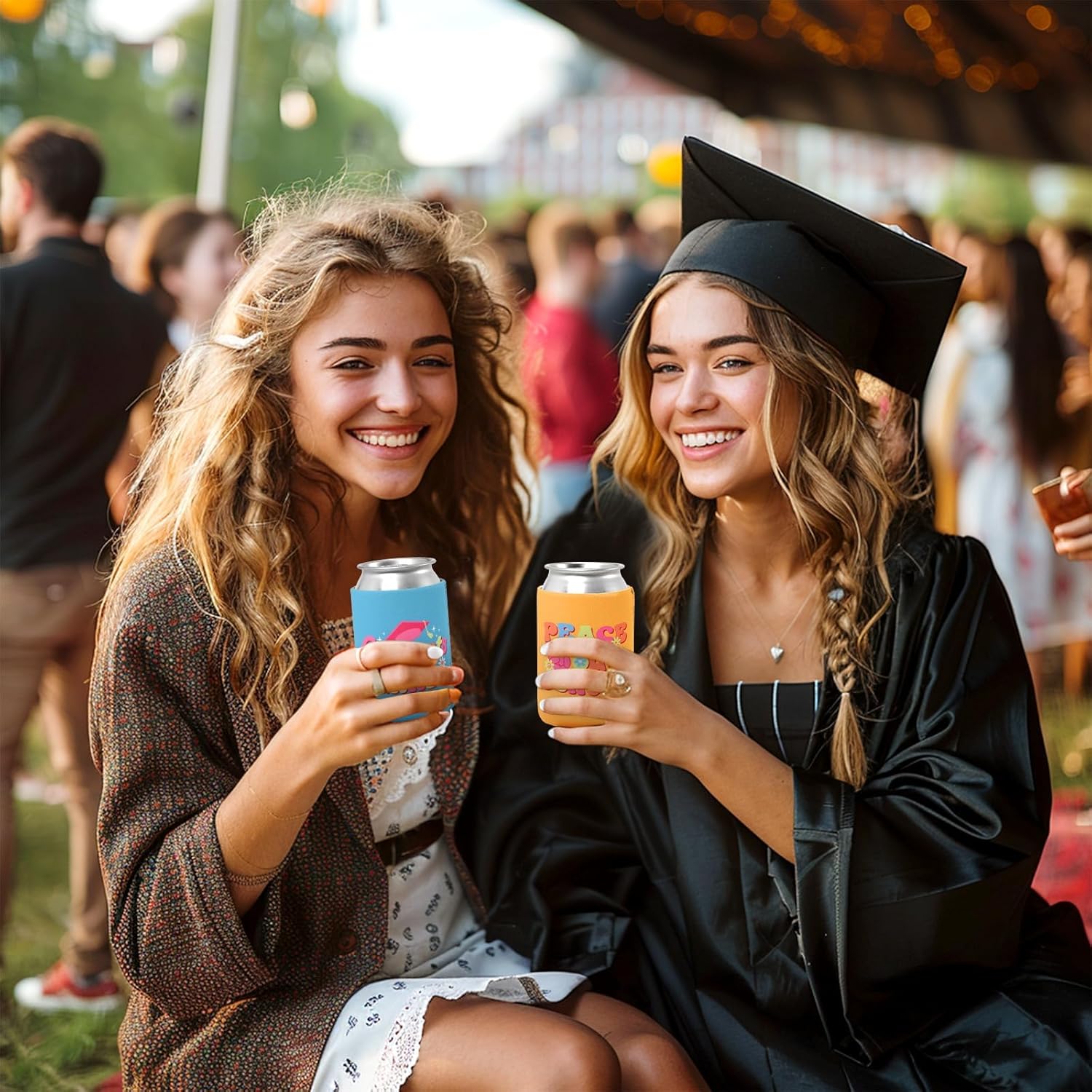 Ideal Size: These hippie-themed grad party bottle coolers, each sized at about 5.5 x 3.5 inches, can hold 12-ounce cans and bottles. They cover most drinks at your graduation party, serving as both practical party supplies and lively 2024 graduation party decorations.