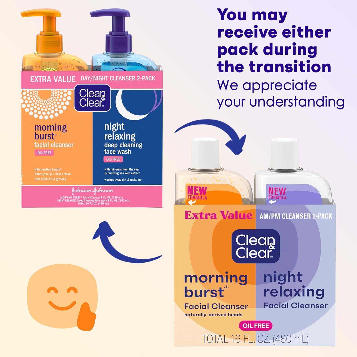 Clean & Clear 2-Pack Oil-Free Facial Cleansers with Citrus Scent, Morning Burst and Night Relaxing, 16 oz