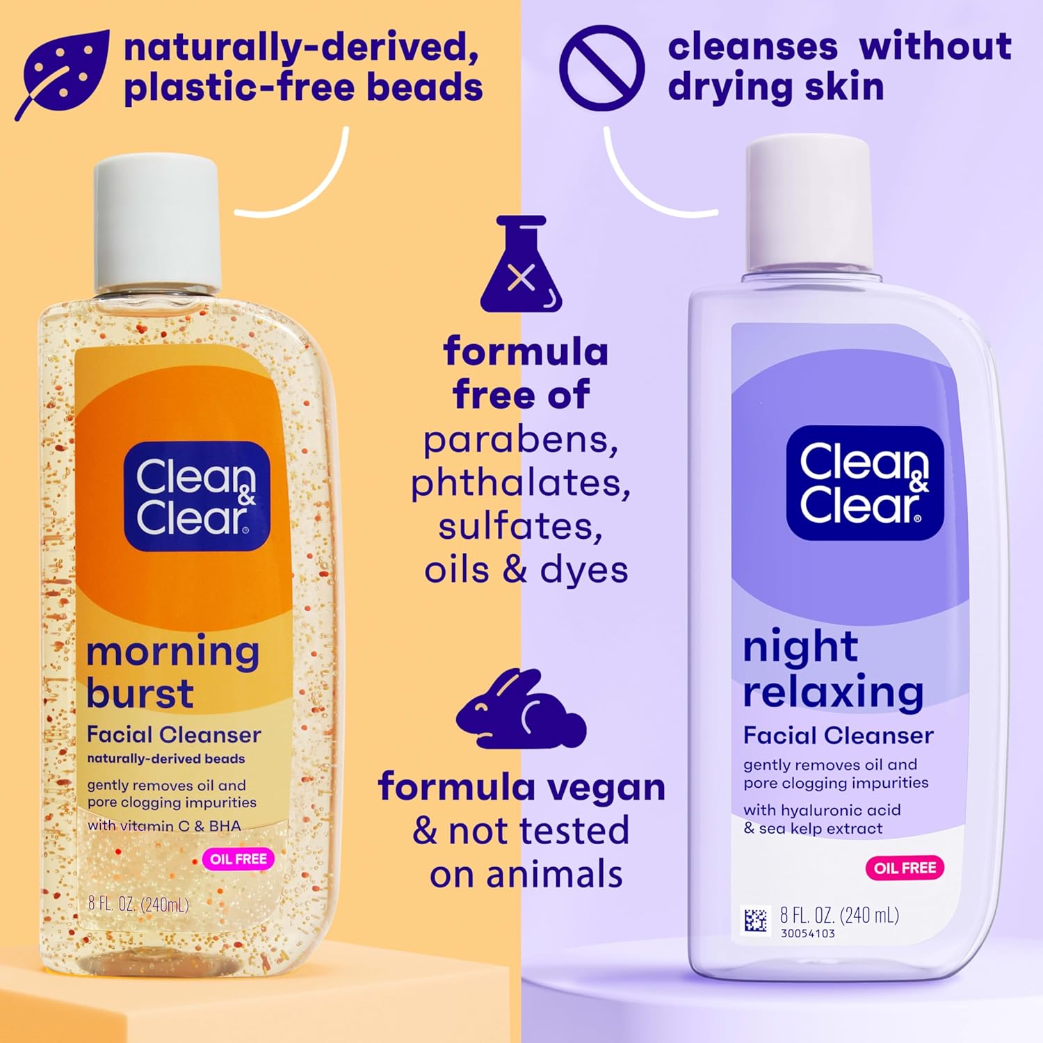 Daily Facial Cleanser Morning and Night Set: One 8 fl oz bottle of Clean & Clear Day and one 8 fl oz bottle of Clean & Clear Night Face Wash; both oil-free and non-comedogenic to gently cleanse without over-drying skin both in the morning and at night