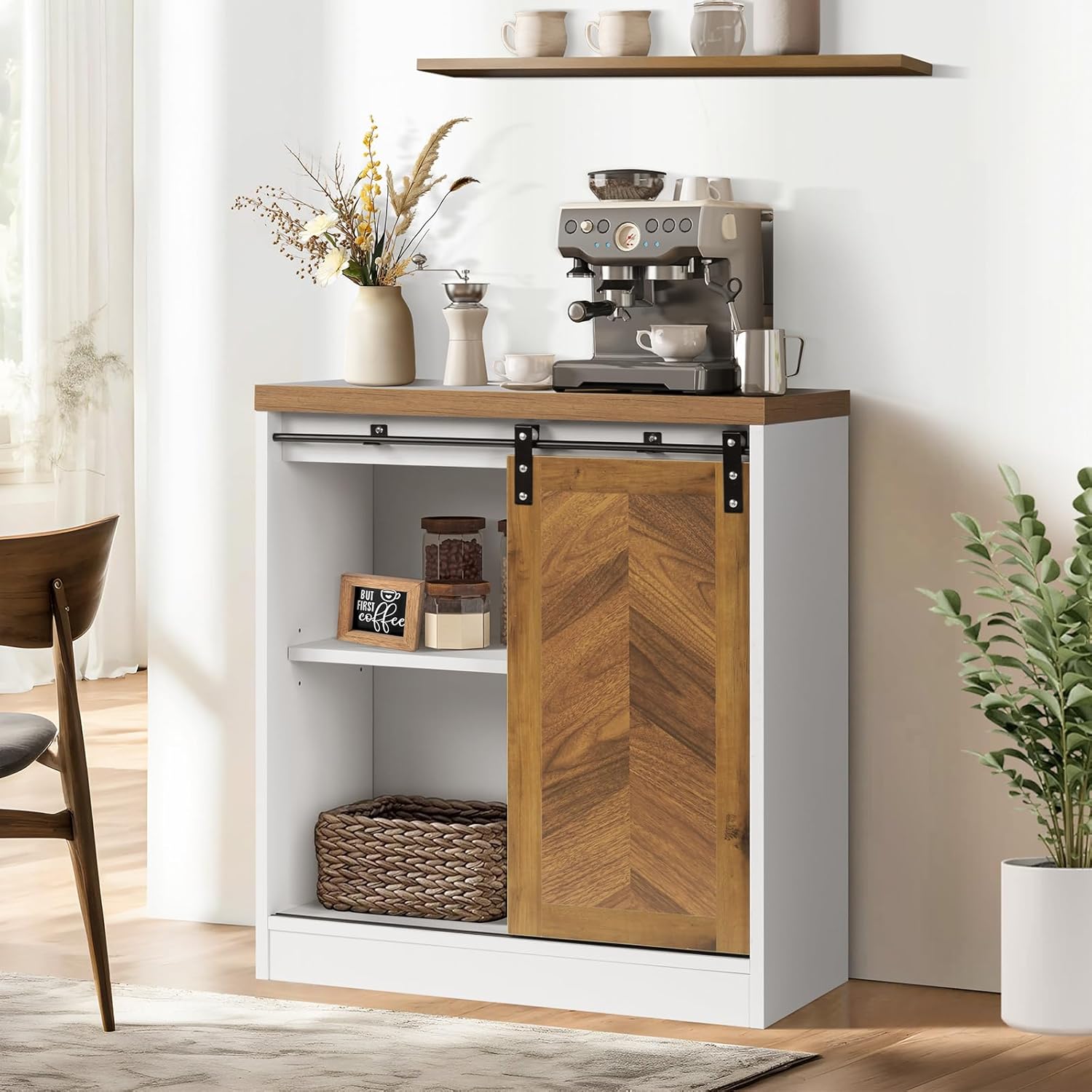 Coffee Station Cabinet:This small coffee station with storage is designed to combine farmhouse and modern styles with a unique sliding barn door design and rustic wood grain. This coffee station meets the requirements of storing items, also adds a unique aesthetic to your home.