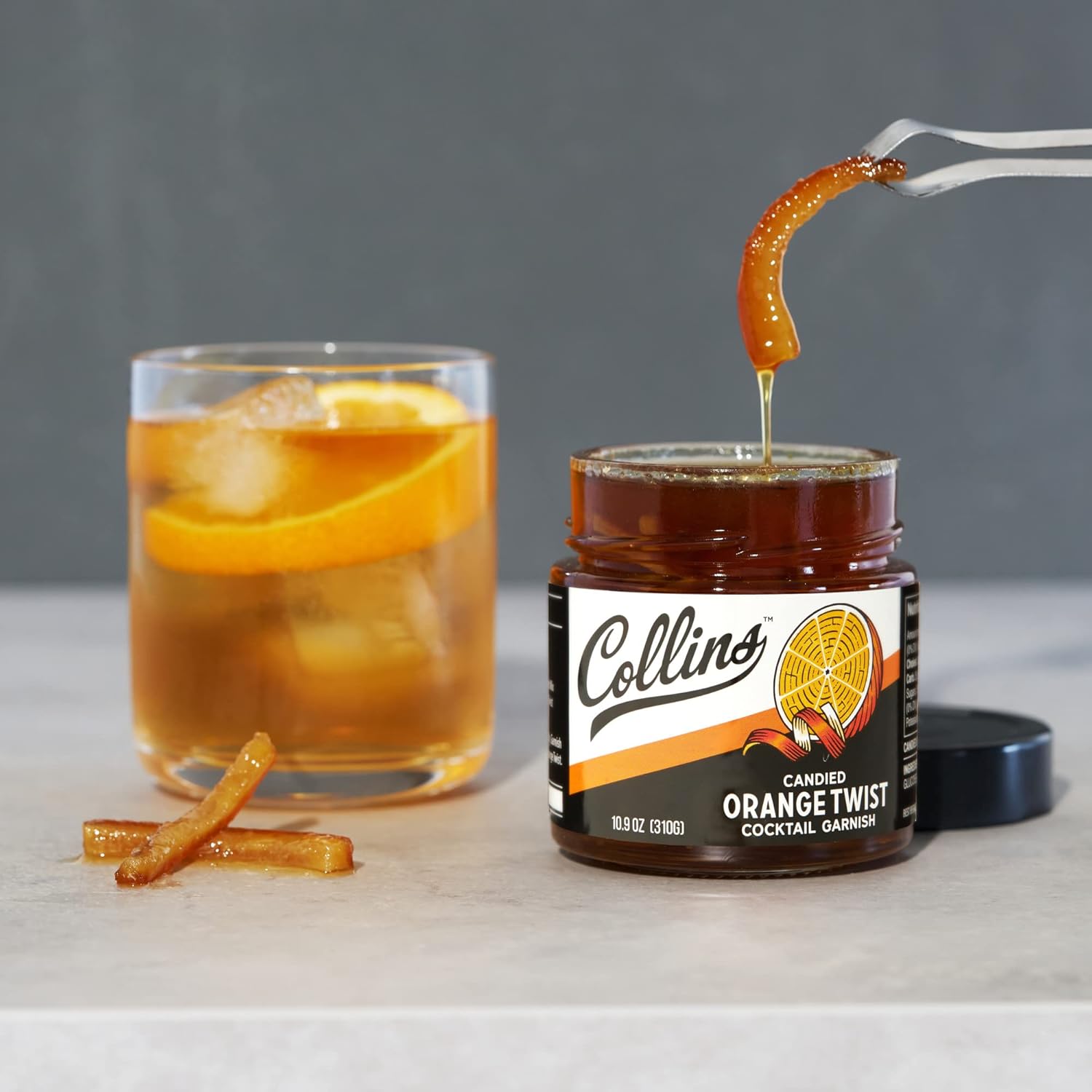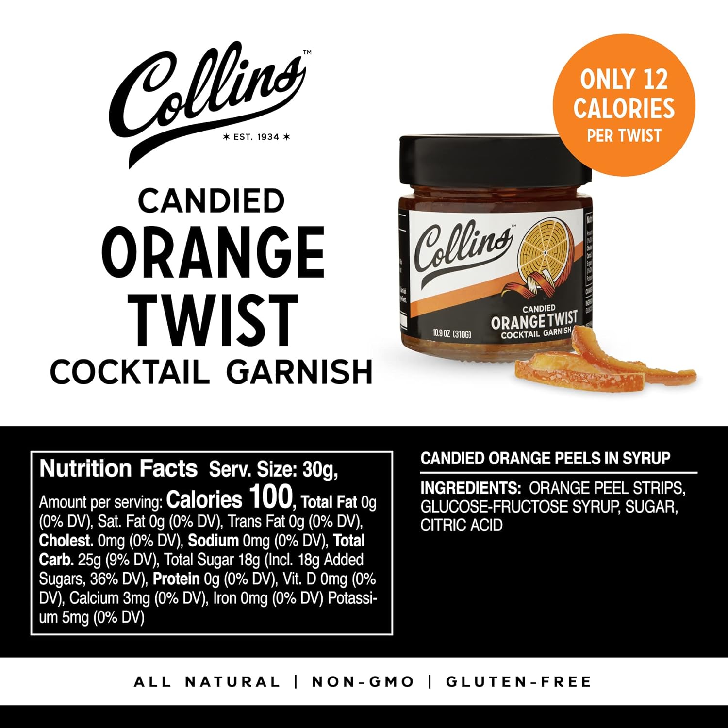 Collins Candied Fruit Orange Peel Twist in Syrup – Popular Cocktail Garnish for Skinny Margarita, Martini, Mojito, Old Fashioned Drinks, Peel for Baking, 10.9oz.