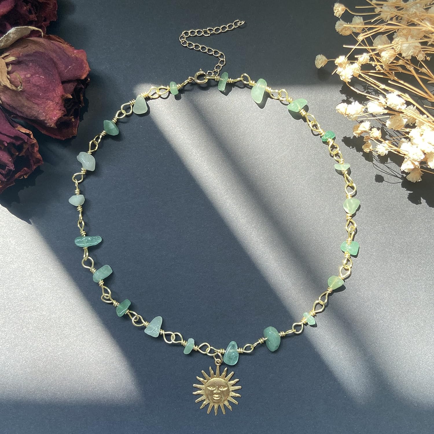 the necklace is very very fragile. every time i put it on i’m afraid i’ll break it. the packaging it came in was very cute and it had a little silk bag and a card. the necklace itself is beautiful but the wire is easy to bend or potentially snap if roughly handled. i bought the rose quartz one and it’s very cute but be warned if you have light skin like me the crystals will blend in almost too much with your skin tone. at the end of the day it’s a pretty good purchase but be careful with it!!