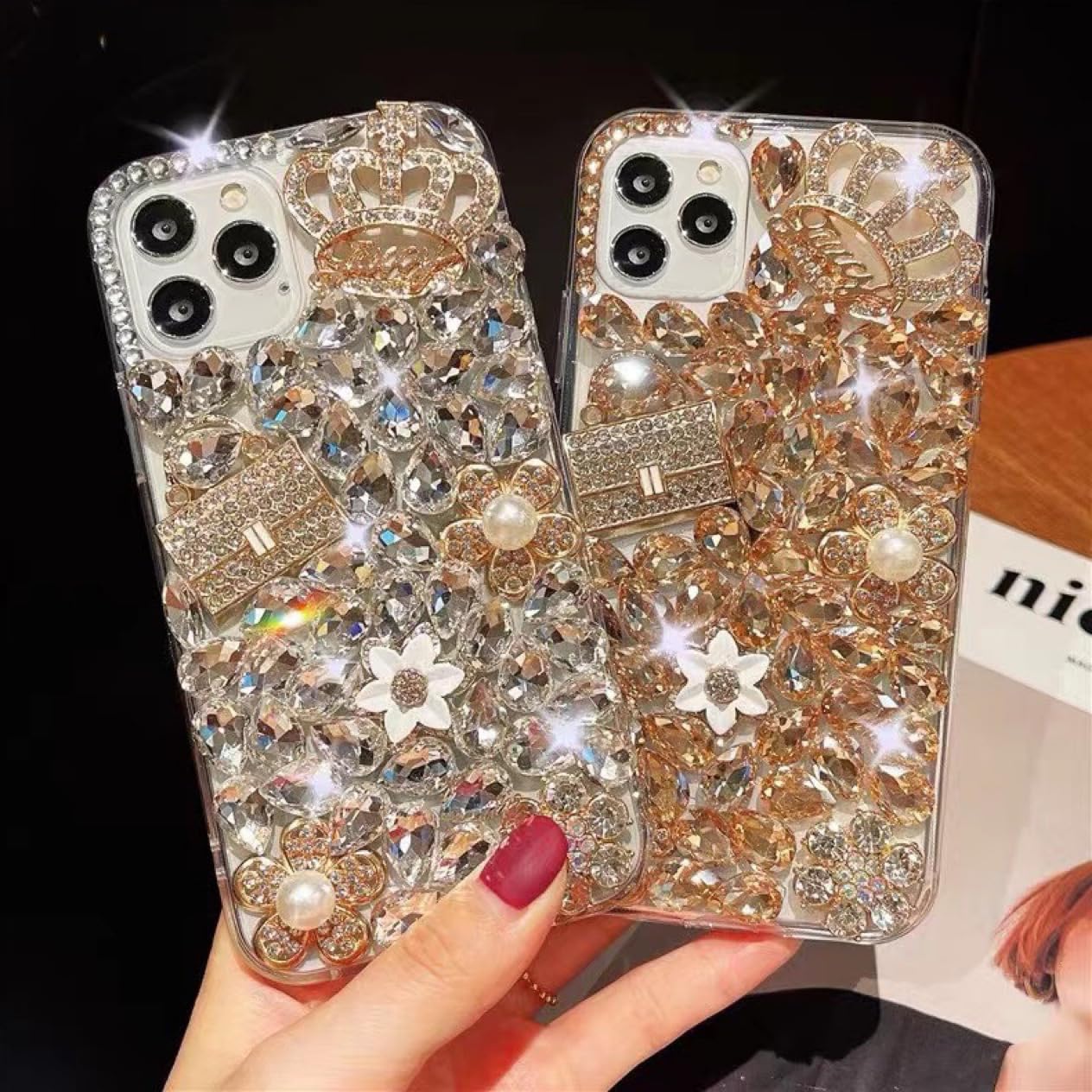Compatible for iPhone 14 Pro Max Glitter Bling Case,Cute Luxury 3D Diamond Glitter Sparkle Crystal Rhinestone Women Girls Crown Handbag and Flower Gemstone Clear Bumper Protective Case