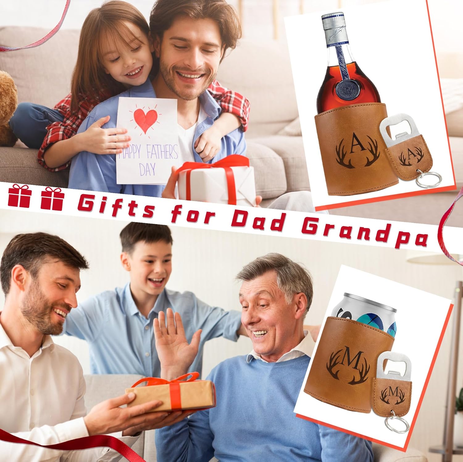 [Initial Fathers Day Birthday Retirement Gifts for Dad Grandpa] Fathers Day birthday gift ideas for dad grandpa from son daughter grandson granddaughter; practical beer beverage cooler sleeves holder and bottle opener set for fathers daily drink essential use and family camping picnic barbecue drinking.