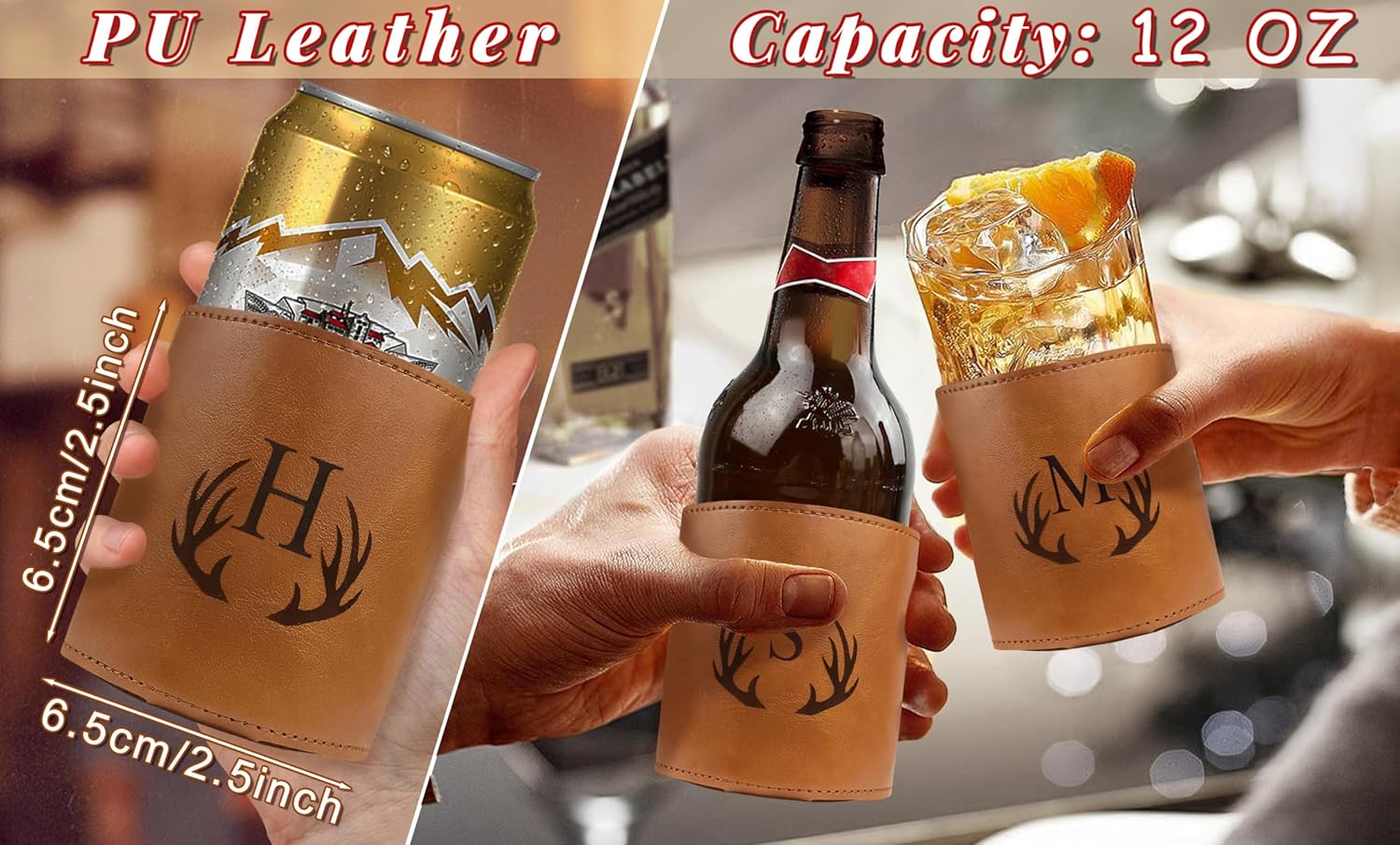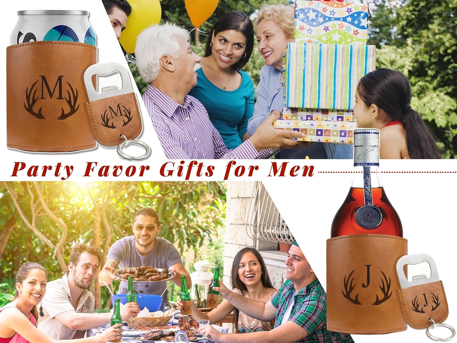 [Unique Company Anniversary Appreciation Christmas Stocking Stuffer Gifts for Colleague Coworker Male Employee] Engraved initial letter on PU leather can coolers and bottle opener, personalized meaningful gifts for company stuff appreciation party and mens birthday presents popular favors.