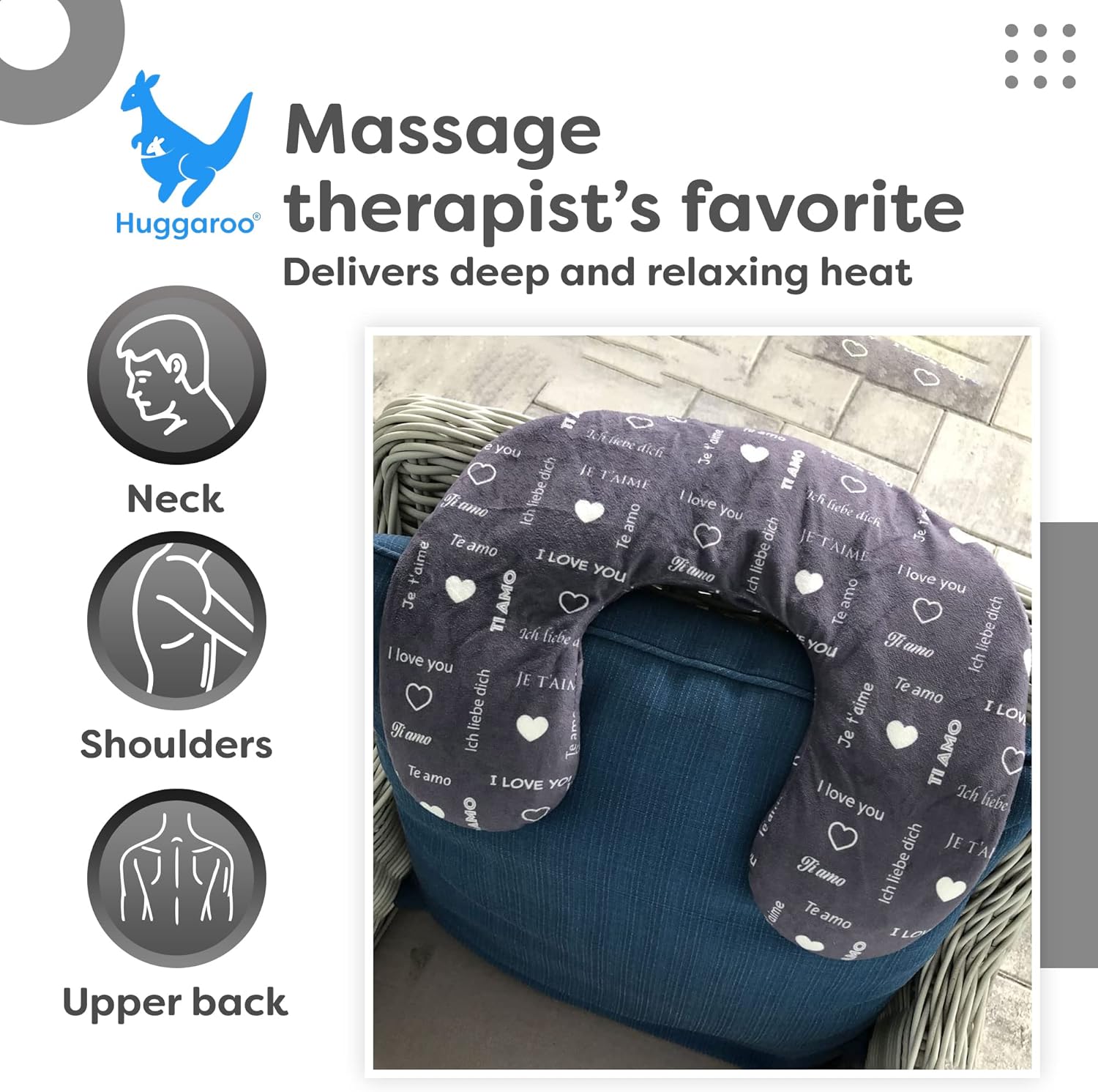 Bring to a Hospital Visit or a Post-Surgery Gift — The uplifting “I Love You” print will inspire loved ones in a time of need or recovery. Your friends or family will appreciate this get well soon gift that is massage therapists’ favorite. The deep heat is applied to the neck, shoulders, and upper back while relaxing knotted muscles and relieves stress, easing the mind when recovering from an injury. For people with sensory issues, the Huggaroo shoulder heating pad also makes a great neck wrap.