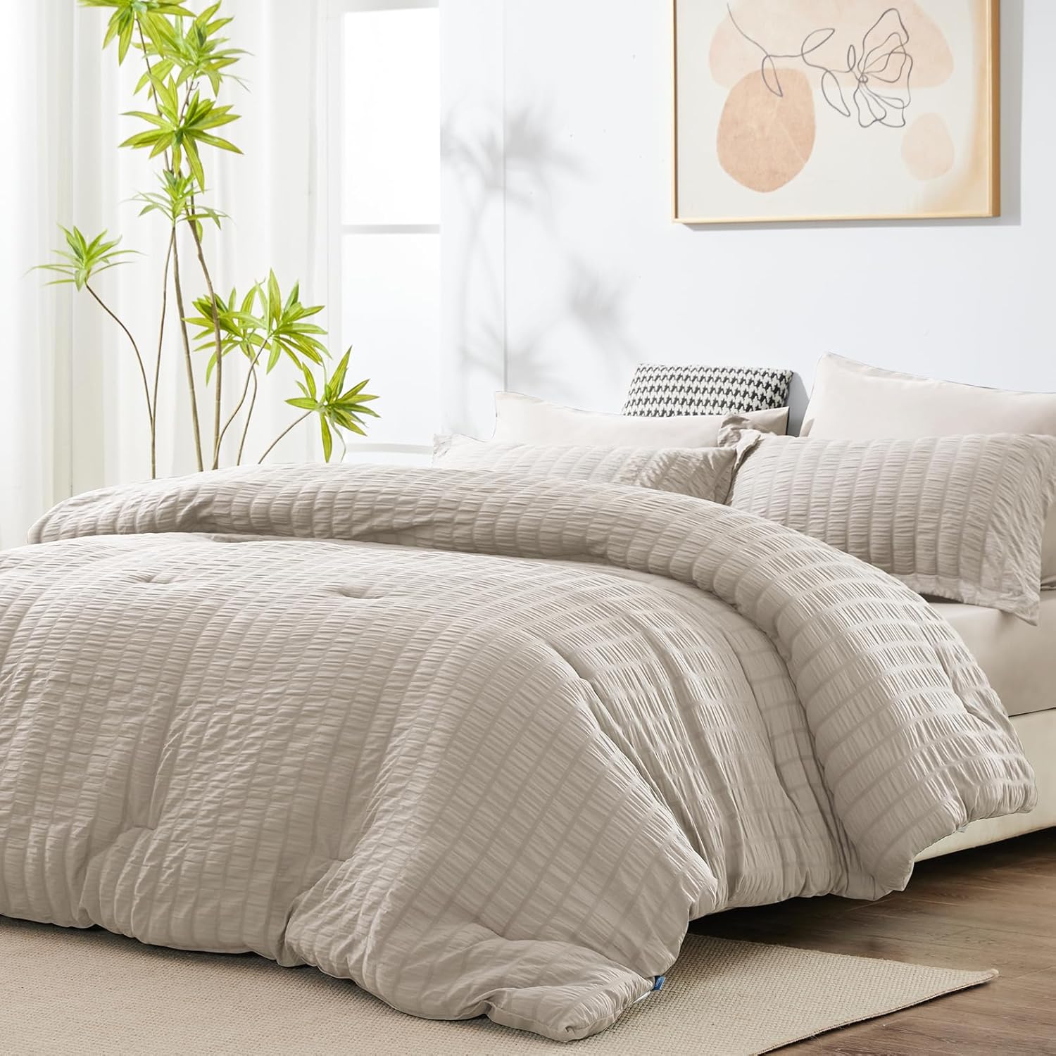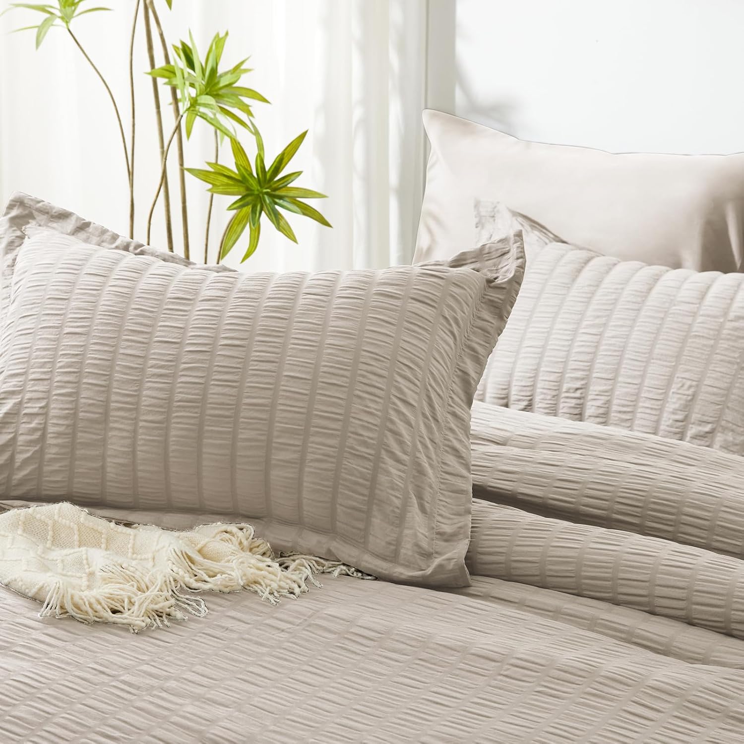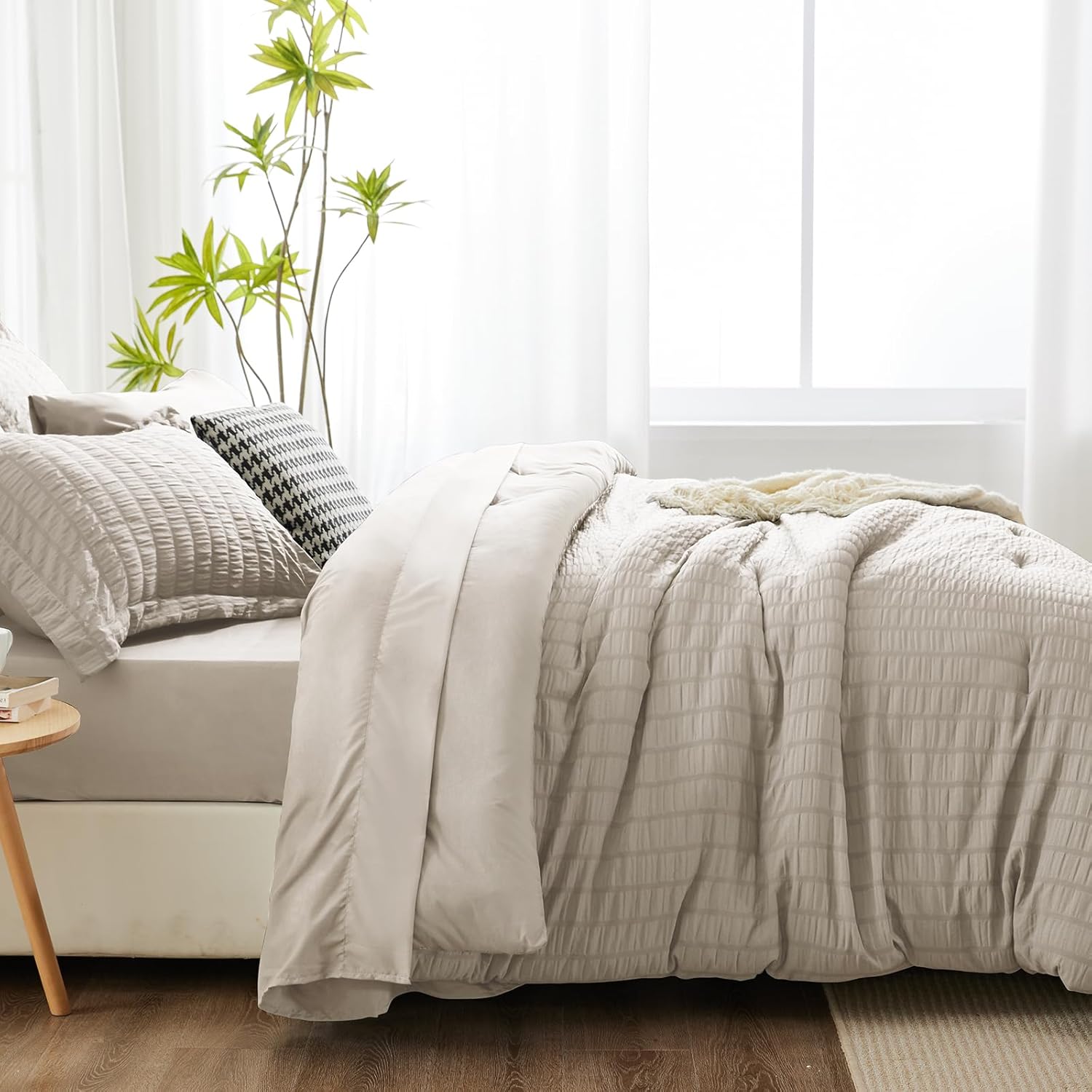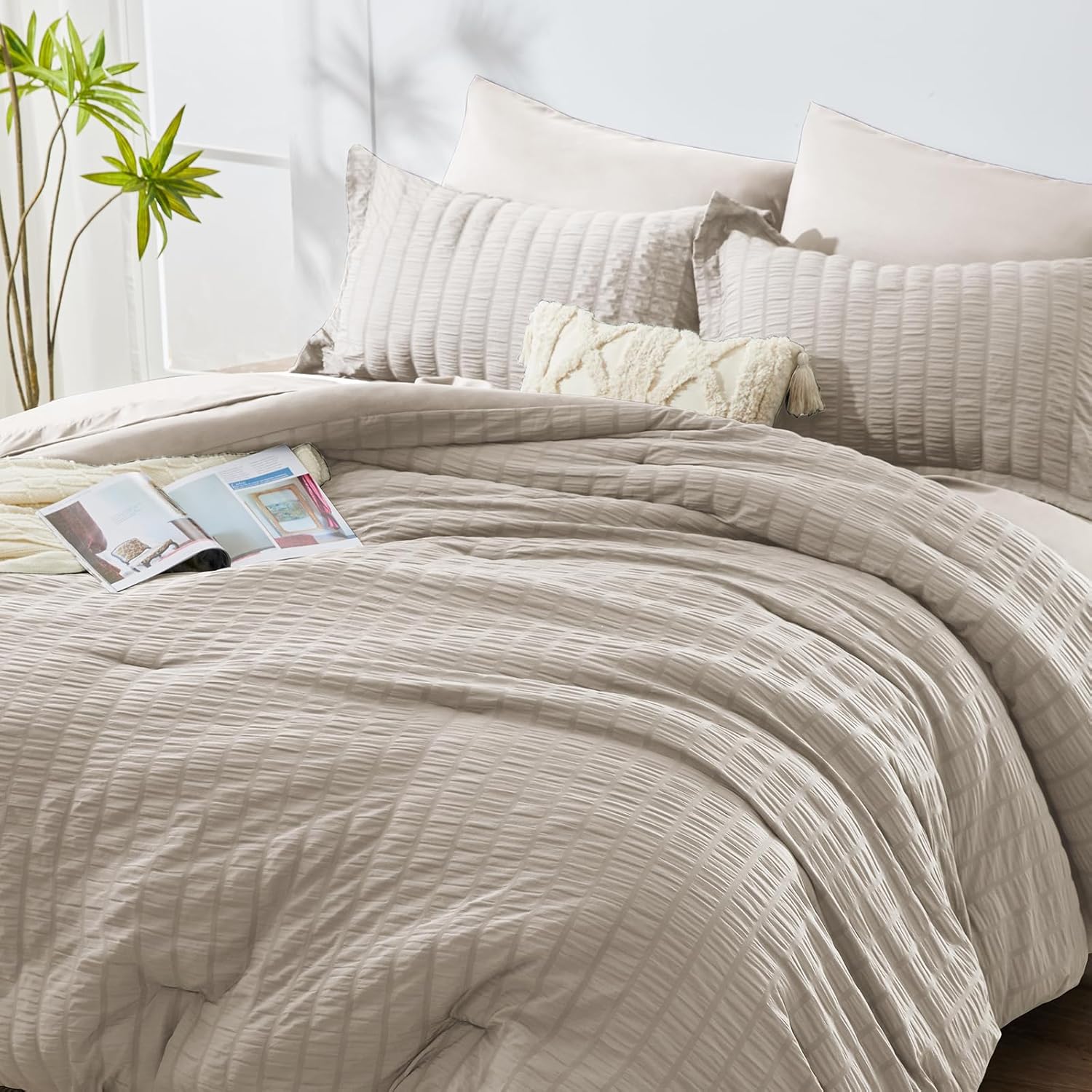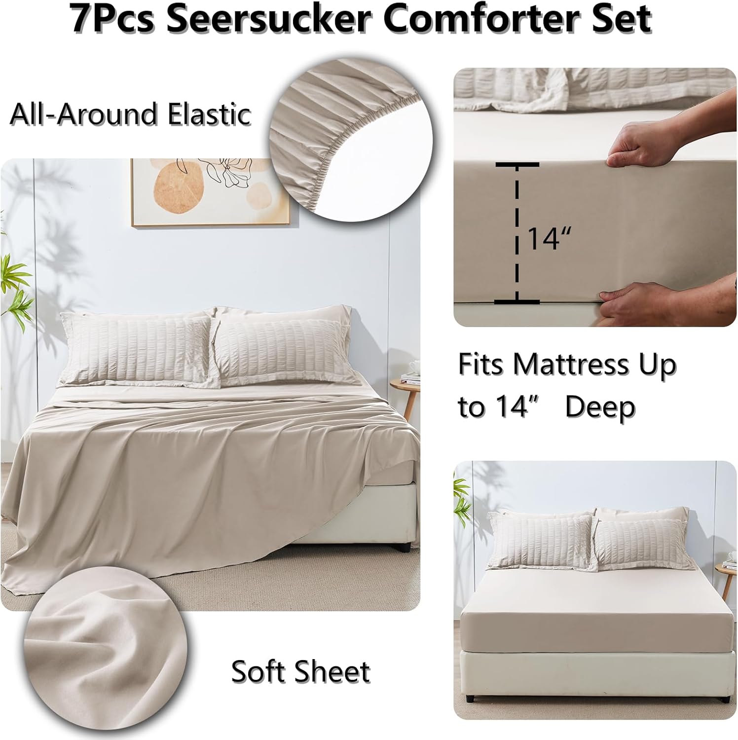 CozyLux Full Seersucker Comforter Set with Sheets Beige Bed in a Bag 7-Pieces All Season Bedding Sets with Comforter, Pillow Sham, Flat Sheet, Fitted Sheet, Pillowcase