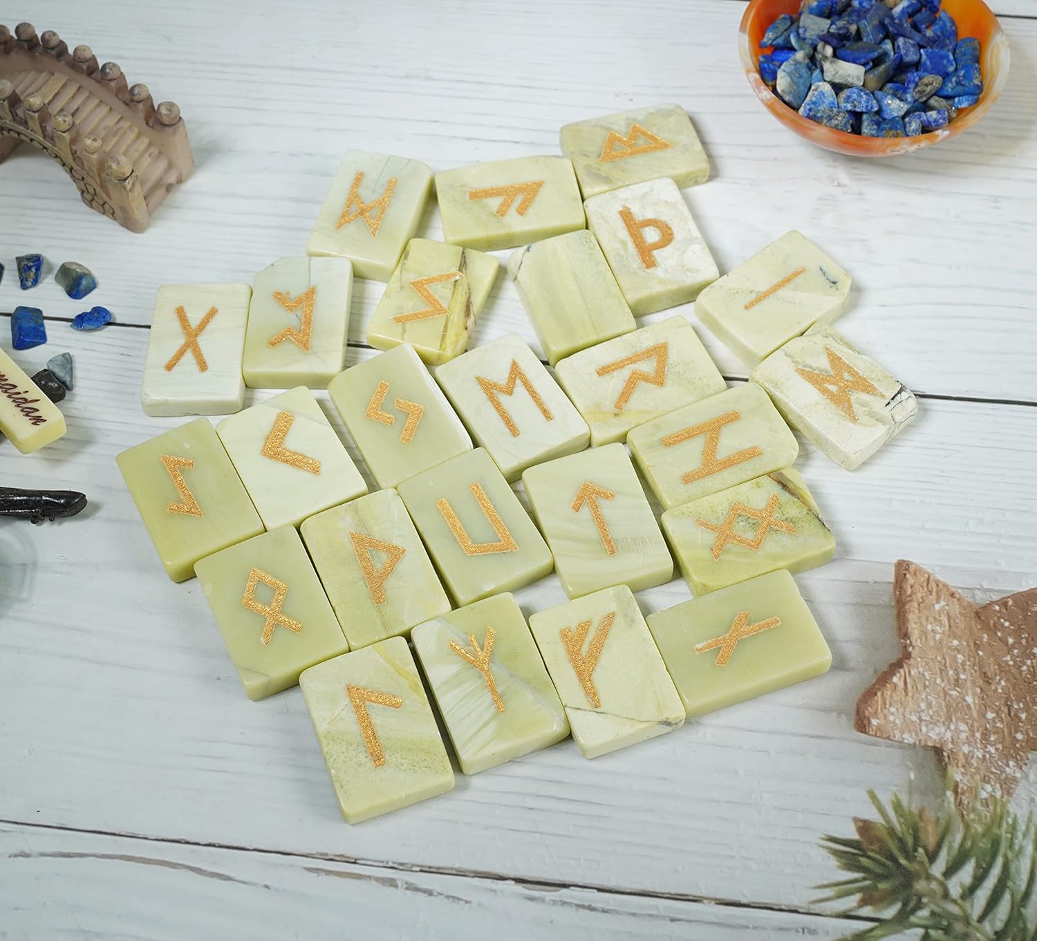 ✨ Kindly note : You will receive similar to the photograph; however, each Handmade Runes set contains a natural stone and will vary slightly. Absolute care will be taken with packing to ensure all the stones stay as perfect as they are in the image. However, the Properties and Healing Qualities will be the same.