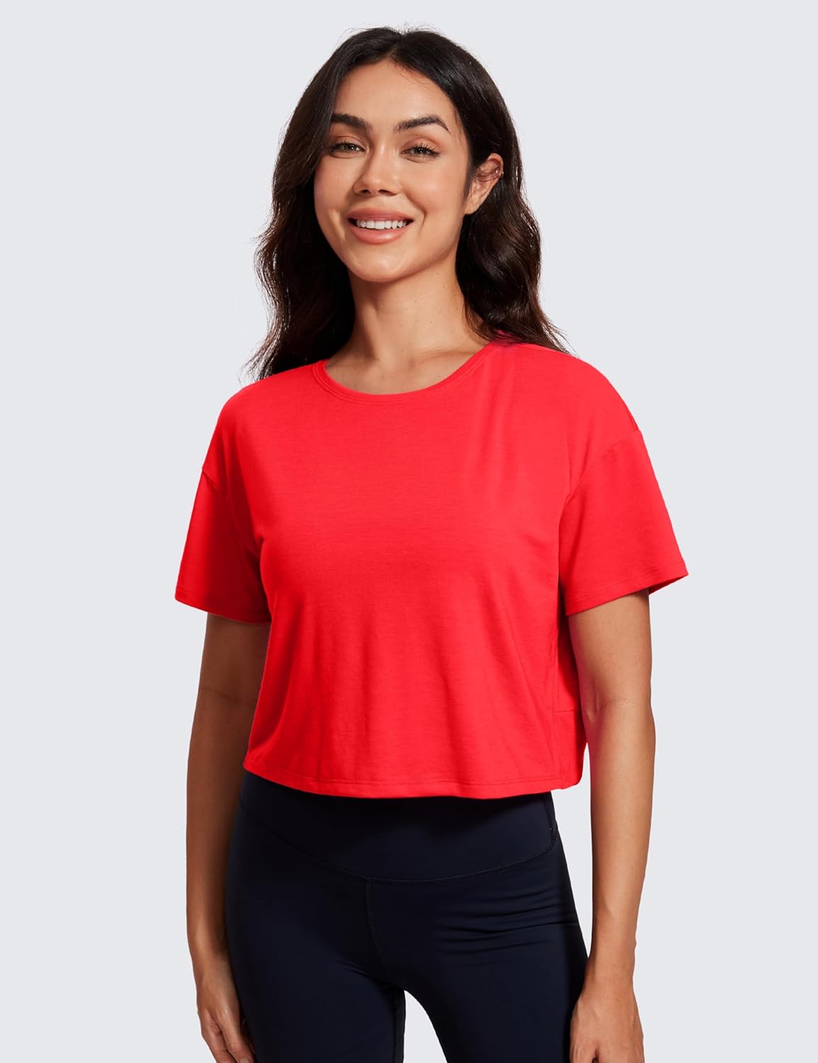 8 reviews for CRZ YOGA Open Back Short Sleeve Crop Top for Women Loose Athletic Yoga Workout Tops Casual Cropped Tee Shirts