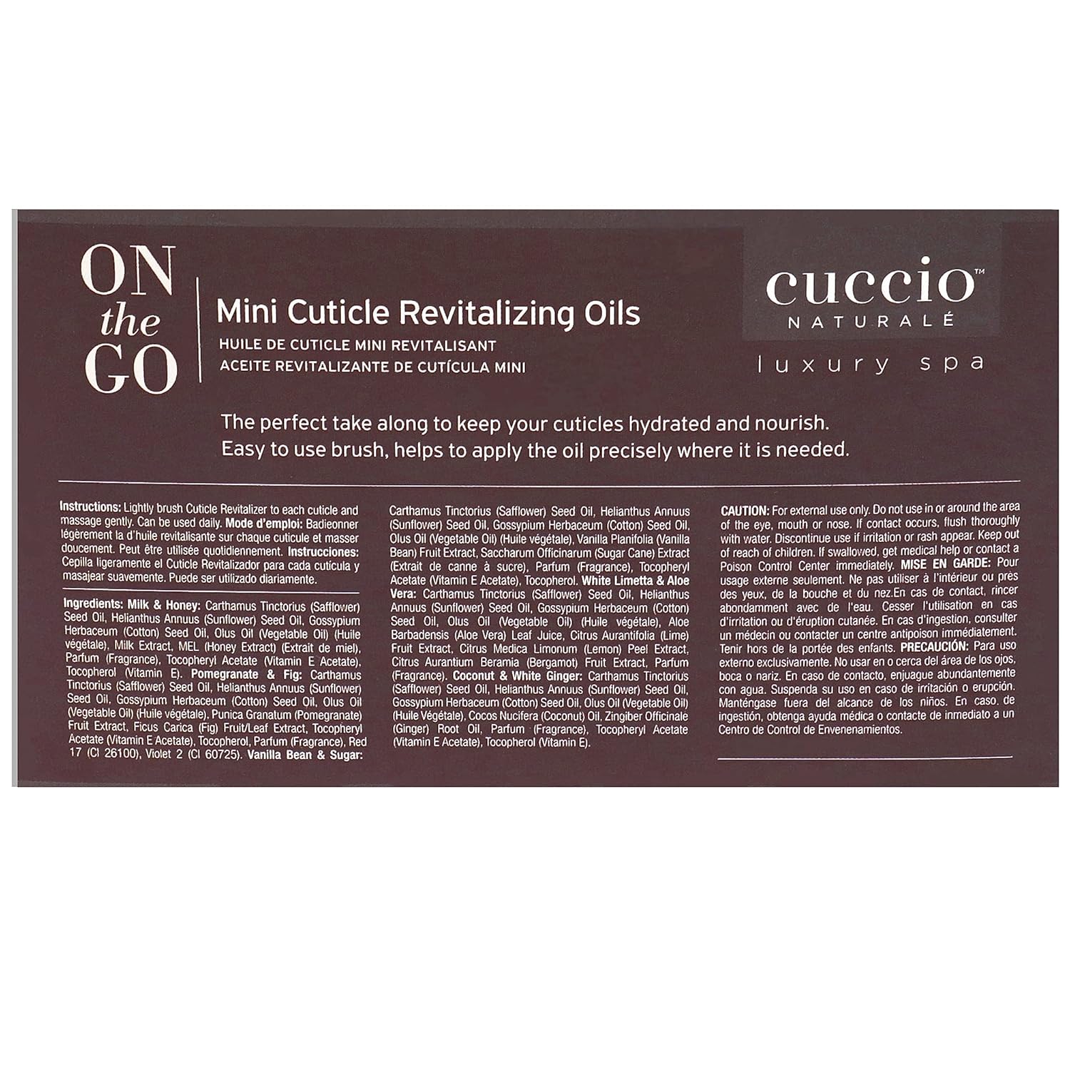 LONGER, STRONGER NAILS. Indulge in a collection of 4 mini Cuccio cuticle oils, in a variety of scents every spa mood. The Mini Kit includes Milk and Honey, Pomegranate and Fig, Vanilla Bean and Sugar, and White Limetta and Aloe Vera fragrances.