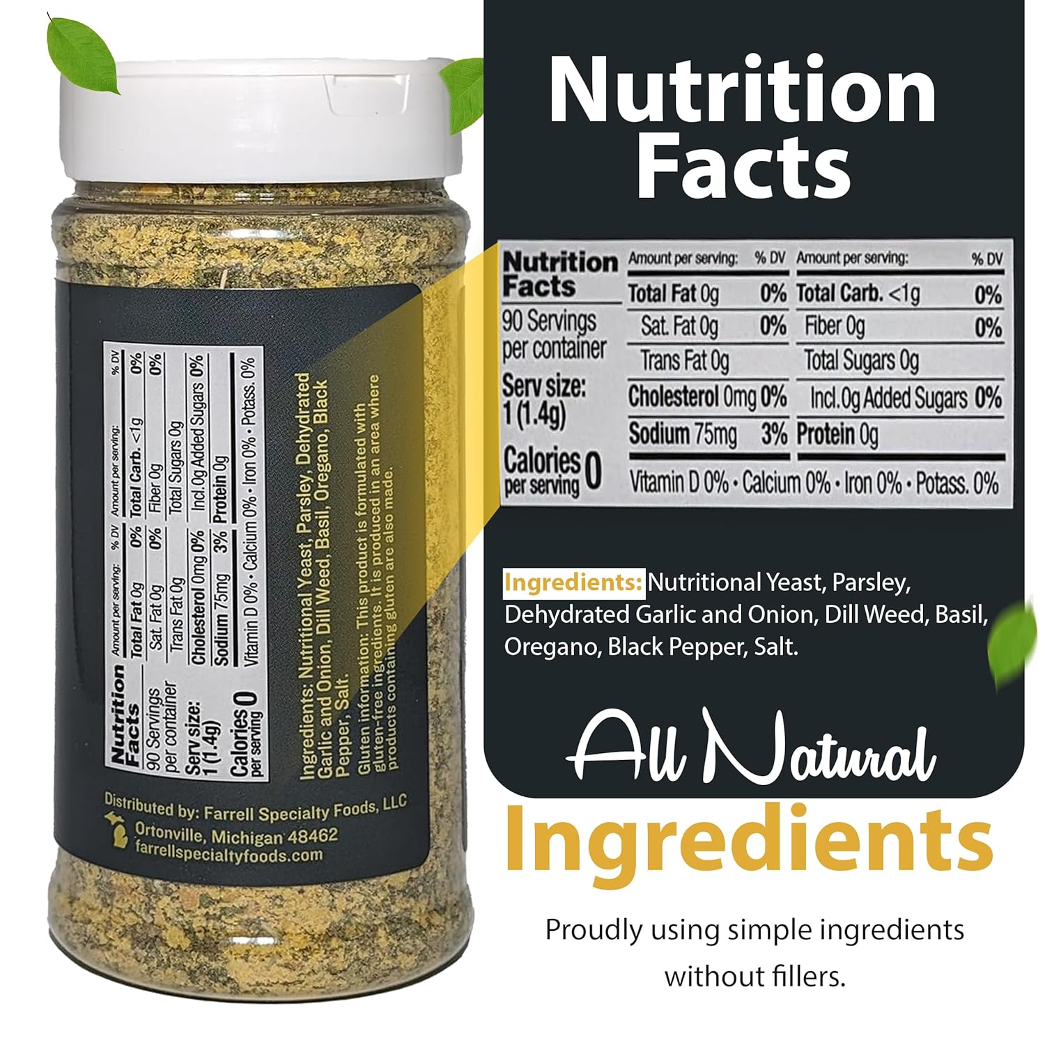 ✔️Natural ingredients: Proudly using simple ingredients without fillers: Nutritional Yeast, Parsley, Basil, Oregano, Dehydrated Garlic and Onion, Dill weed, Salt, Black Pepper.