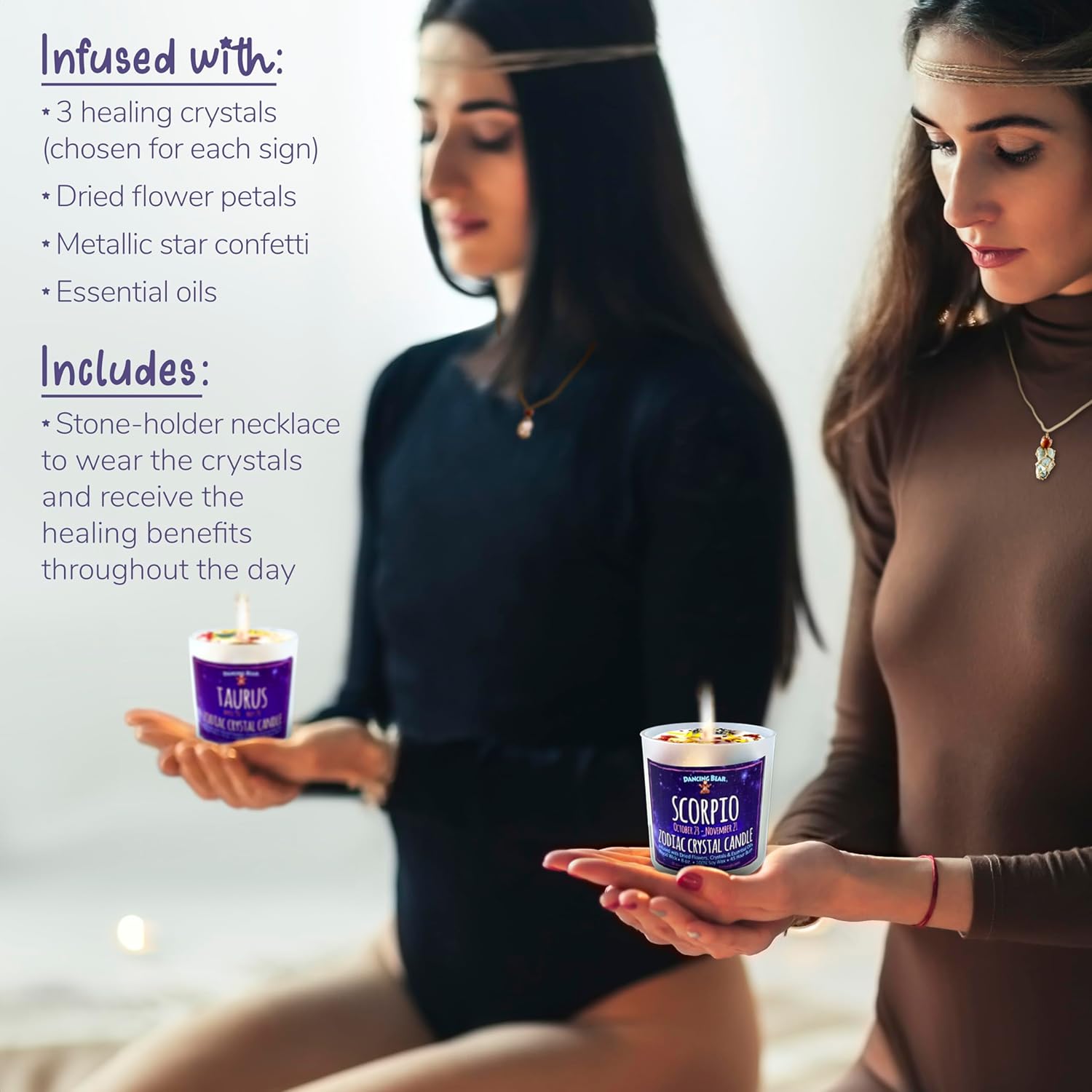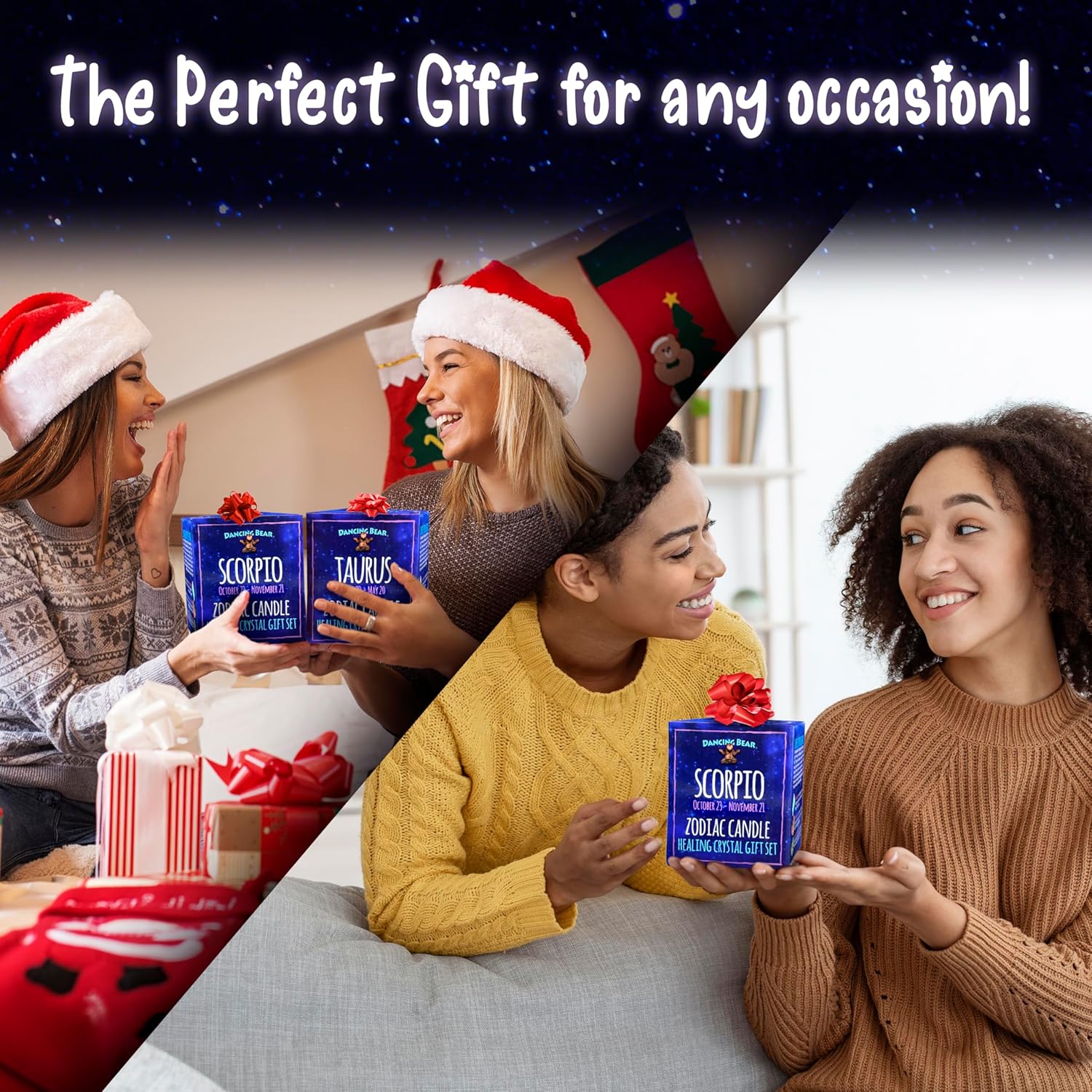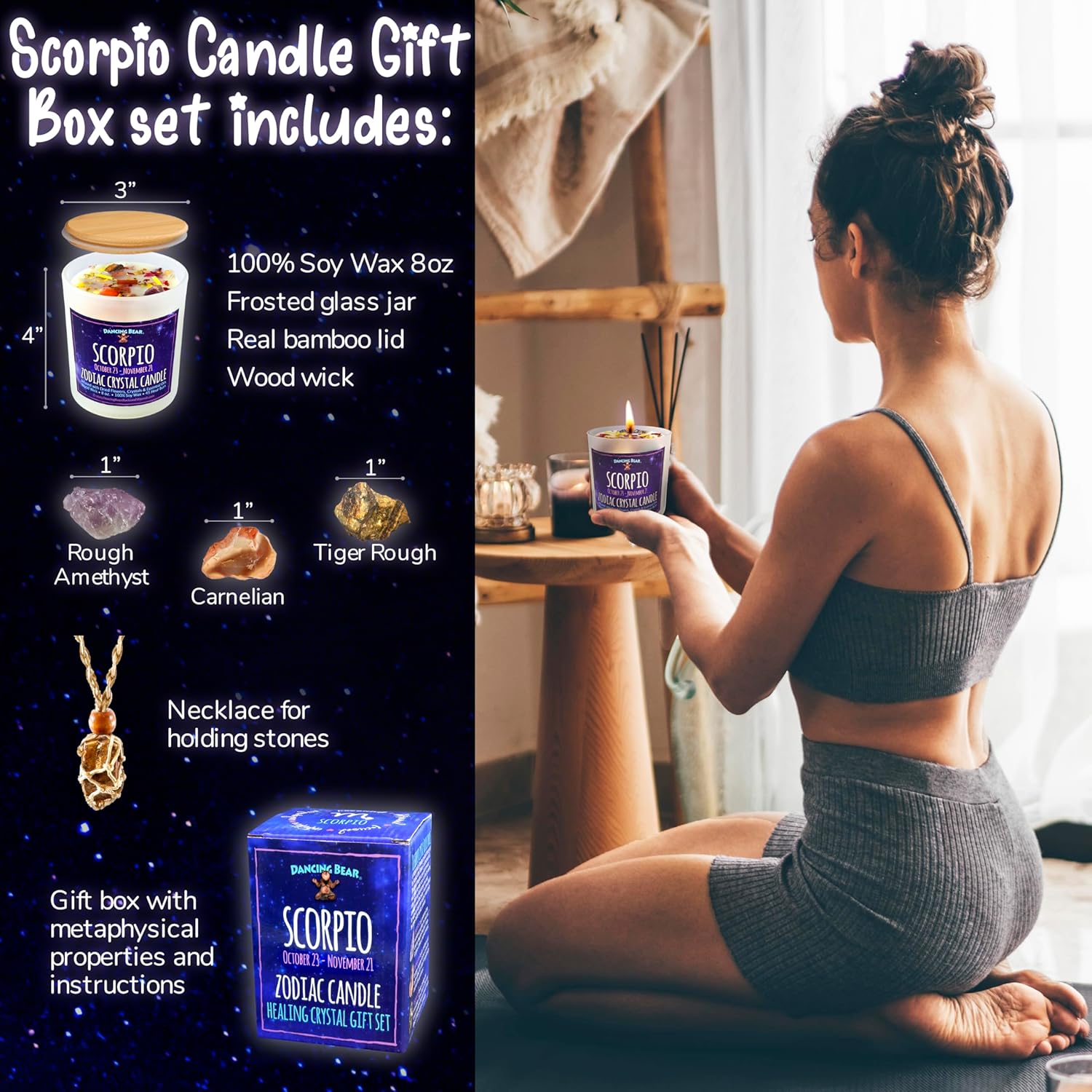 DANCING BEAR Scorpio Zodiac Candle Gift Box Set with 3 Healing Crystals & Stone Holder Necklace, 100% Soy Scented Wax, Crackling Wood Wick, 45 Hour Burn Time