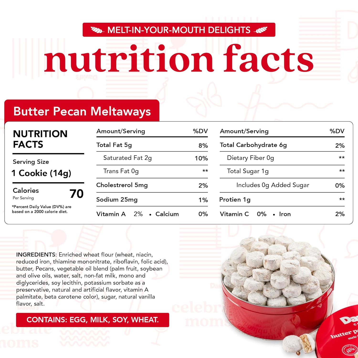 David’s butter pecan cookies are delicious, they come in a nice tin. I gave only four stars because a lot of cookies were broken and there are a lot of crumbs. Other wise it would make a nice gift for people that love cookies.