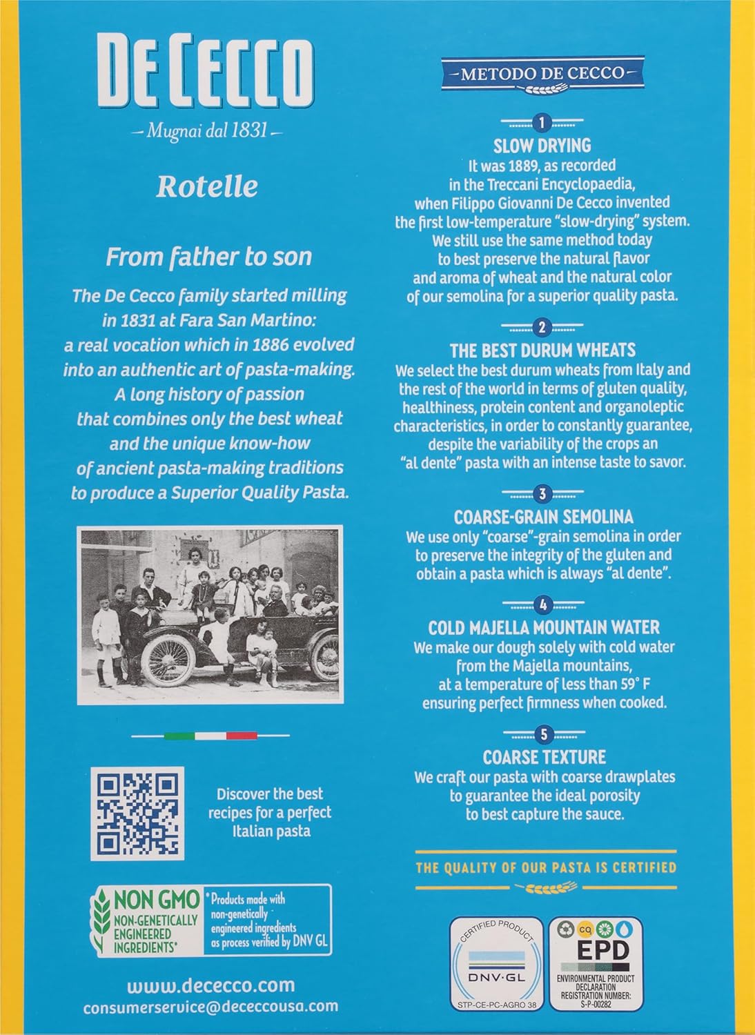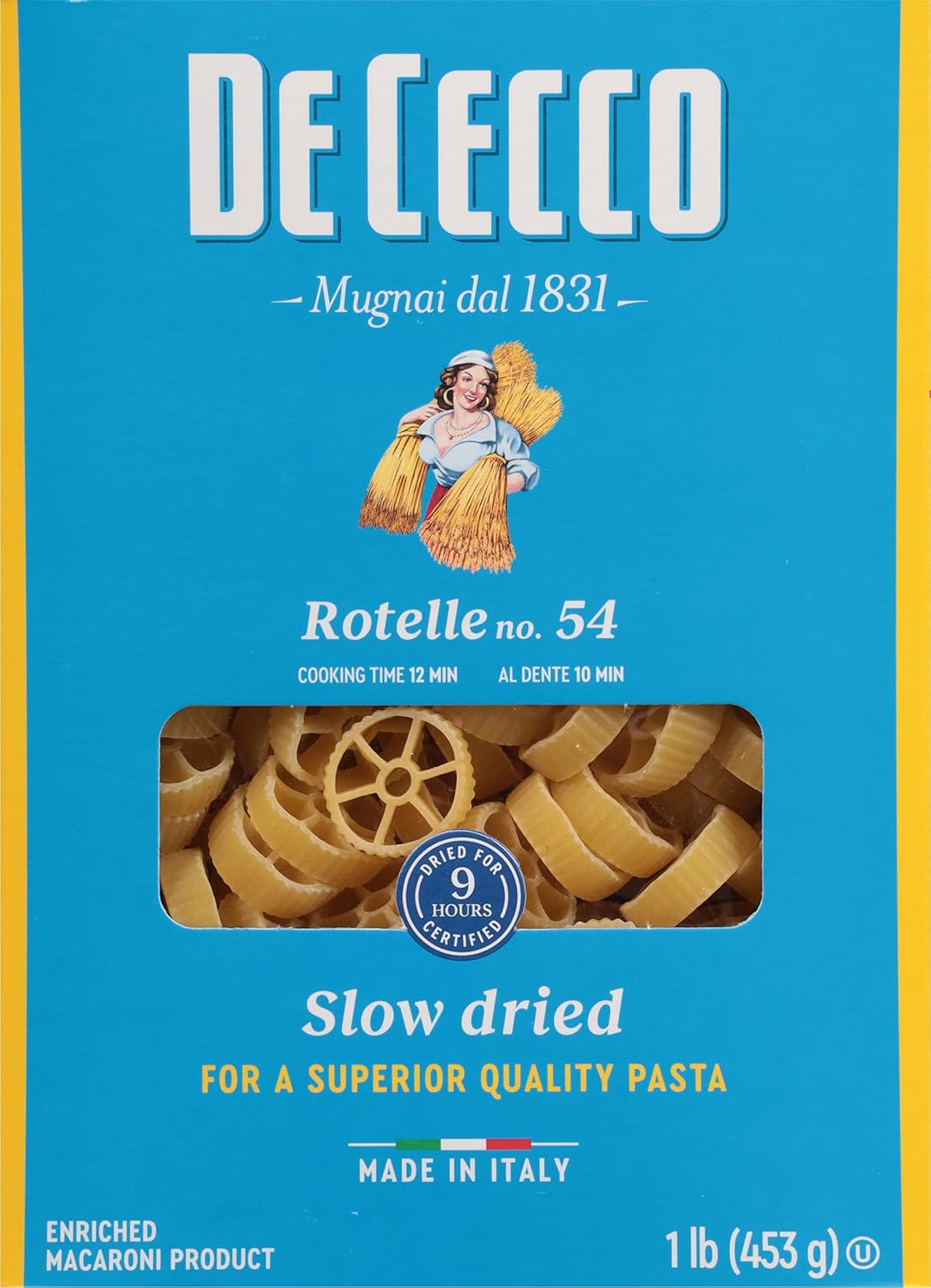 De Cecco gently grinds the heart of each grain, mixes it with cold spring water, then kneads the dough slowly. This results in pasta with the exceptional de Cecco aroma, flavor, and consistency. Pasta easily cooks to perfection, has a great firm texture, and a delicious “fresh” pasta taste. It has a rougher surface, which helps the sauce stick to it. Since 1886 we have liked our pasta to be bronze drawn and slowly dried because we like it to fall into the plate full of taste, rough and always “al dente”. Even though our taste has not changed, as we feel the same love for tradition, we have continued to improve our production technologies. Make de Cecco pasta the secret ingredient for your most amazing dishes.Buon Appetito! From the beginning of the twentieth century, many forms of pasta have been inspired by mechanics and the automotive industry, such as Radiatori (radiators) or Lancette (clock hands). Rotelle (cog wheels) are also a result of this tradition and have a round shape with spokes joined to a ridged rim. Enjoy them served with tomato sauce with or without meat, or alternatively this pasta is perfect in broth and minestrone soups. Try them when preparing delicious, colourful pasta salads. Available in 1 lb.