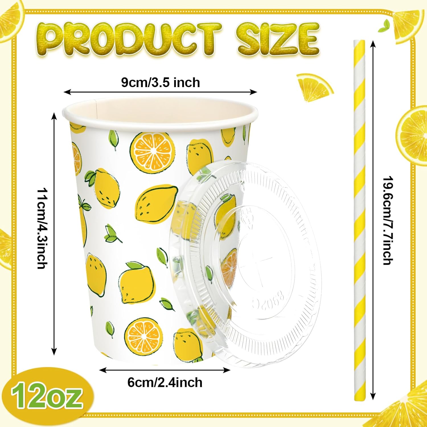Proper Capacity: the lemonade pitcher is 0.92 gallon/ 3.5L in capacity and measures about 5.83 x 8.46 x 5.31 inches/ 14.8 x 21.5 x 13.5 cm, the capacity of the lemonade paper cup with a lid is about 12 oz, the straws are 7.72 inches in length