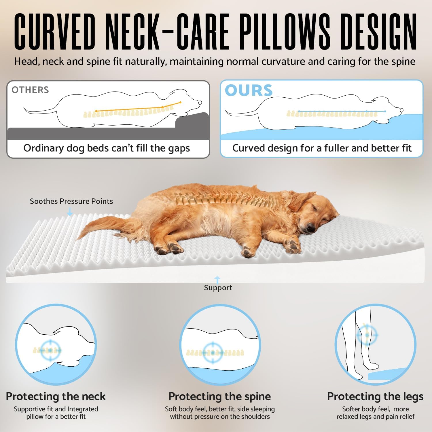 【Curved Bolster Design】The contoured pillow is integrated with the bed base to conform to your dog’s body, accommodating how dogs sleep and rest. It uses high-density memory foam core that can support up to 250 lbs, providing comfort while the support foam base is sturdy. The responsive foam relieves pressure points , preventing pressure sores and promoting blood circulation.