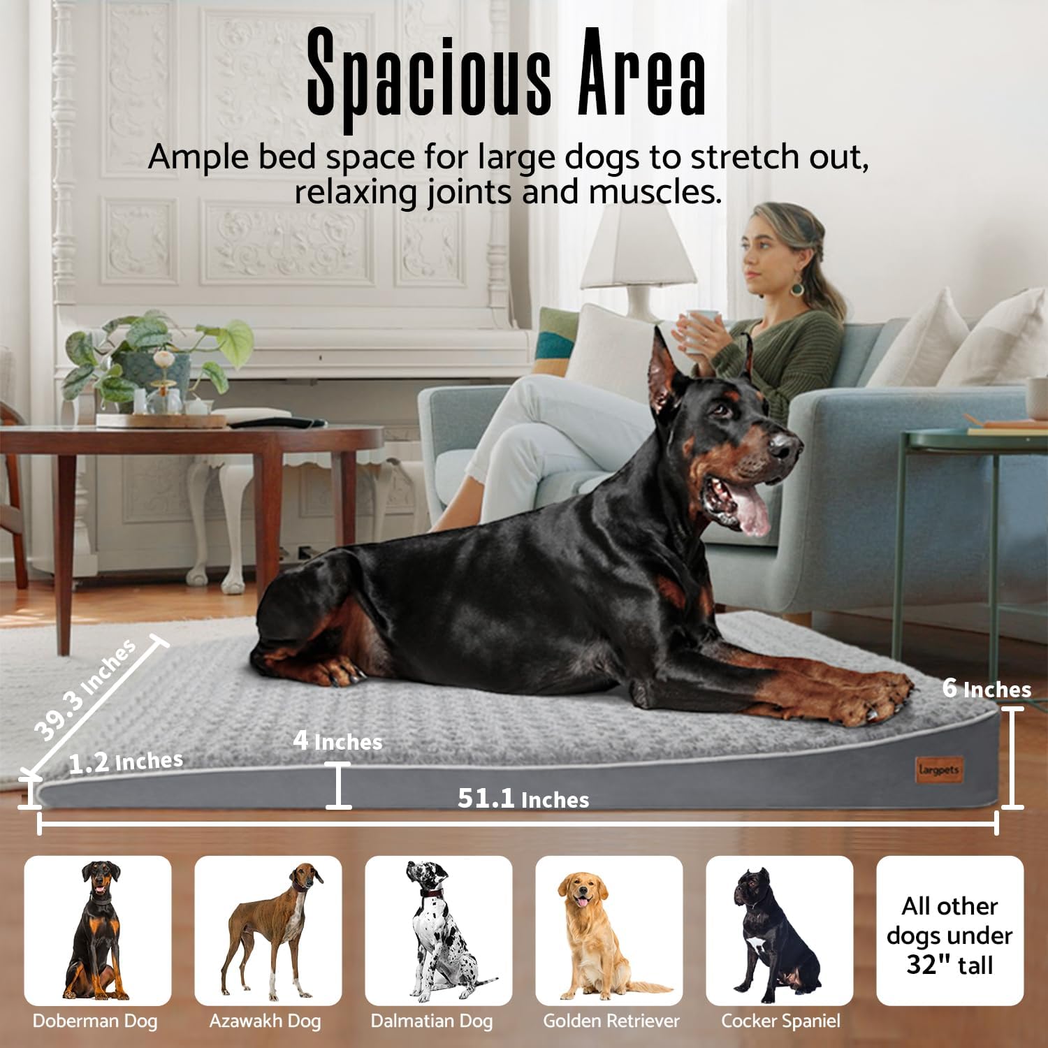 【Extra Large】With dimensions of 51.1″ X 39.3″ X 6″, this extra large orthopedic dog bed provides enough space for large and giant breed dogs to fully stretch out. Kids can also interact with their furry friends on this bed. Give your beloved pup a place to rest and recharge.