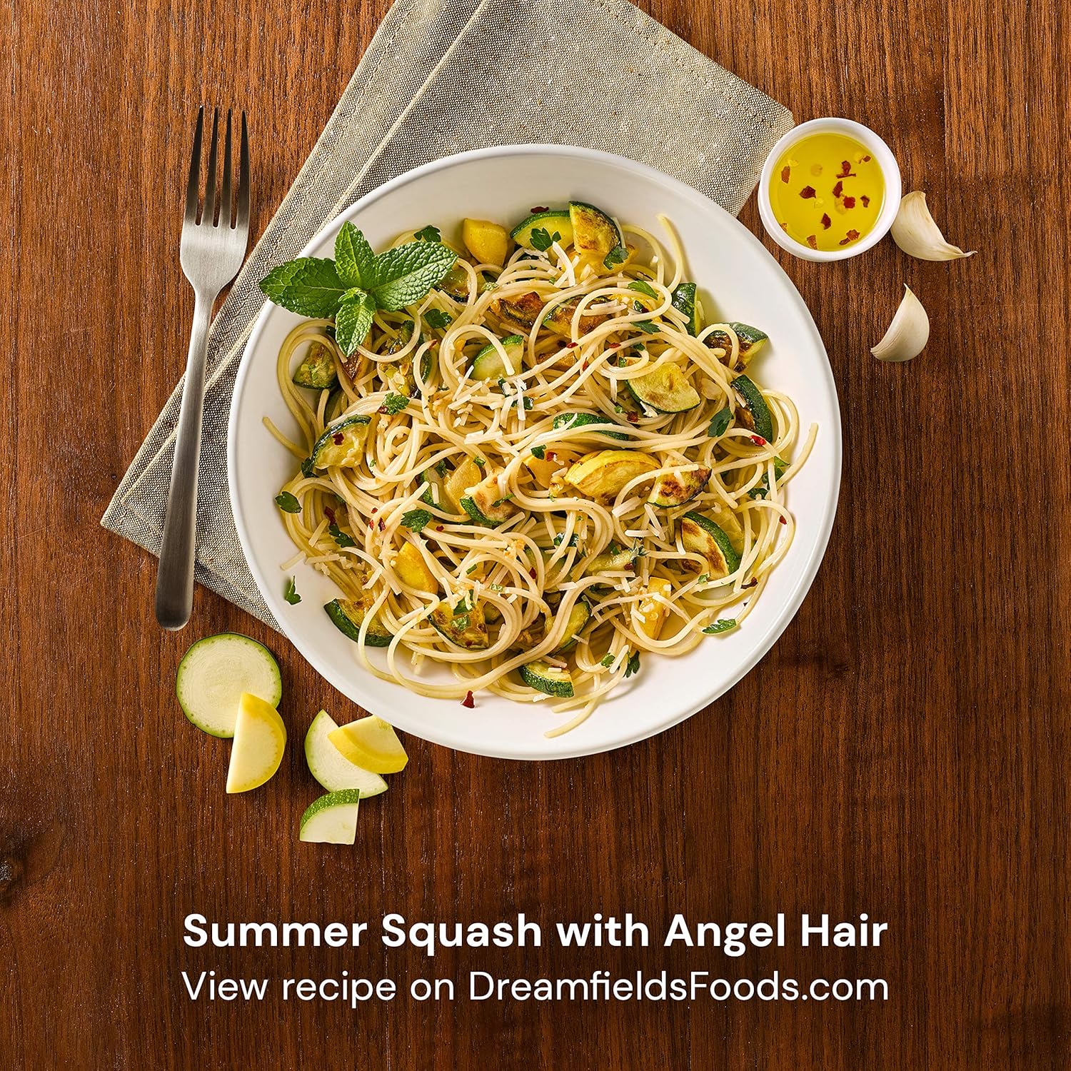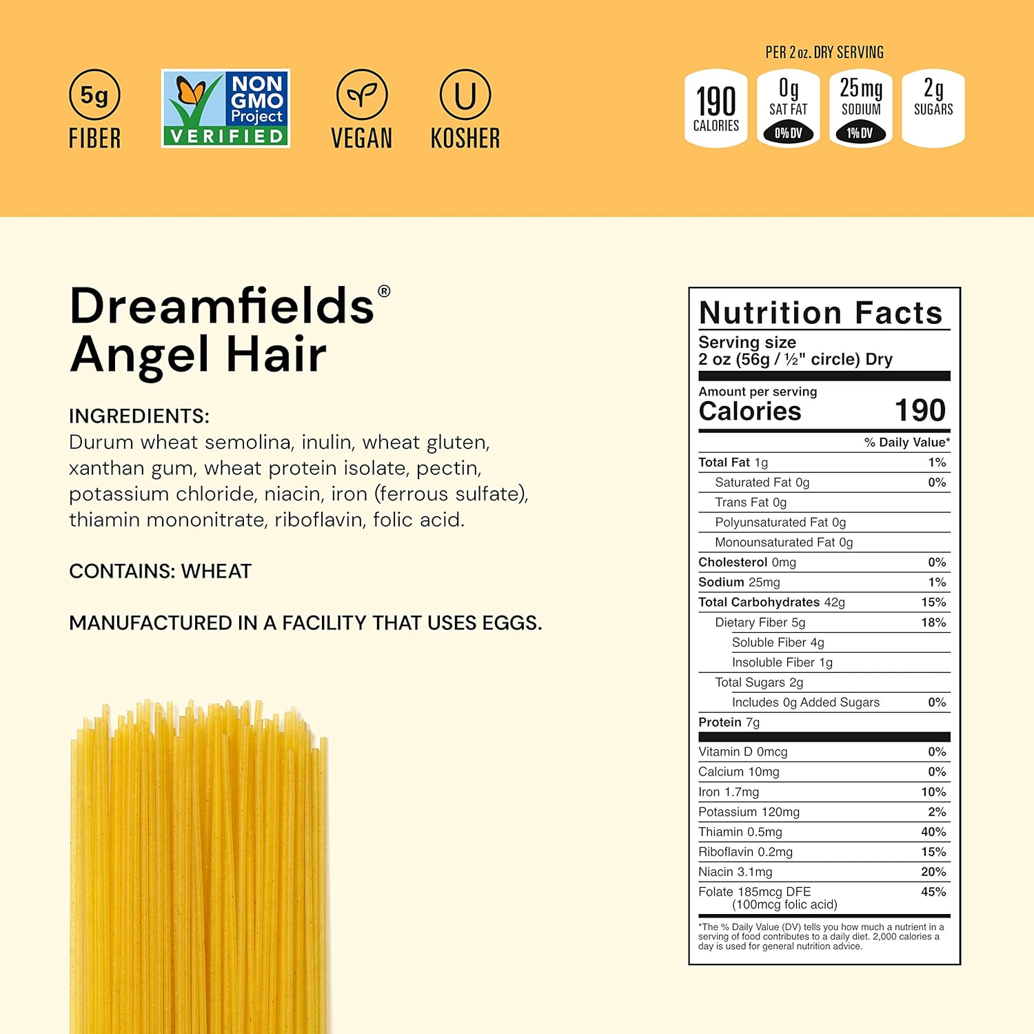 Dreamfields Healthy Pasta Living Angel Hair are long, thin stands of pasta, making it a good choice to pair with lighter sauces. Dreamfields Angel Hair cooks up in just 5 minutes. This makes it a great match for seafood.