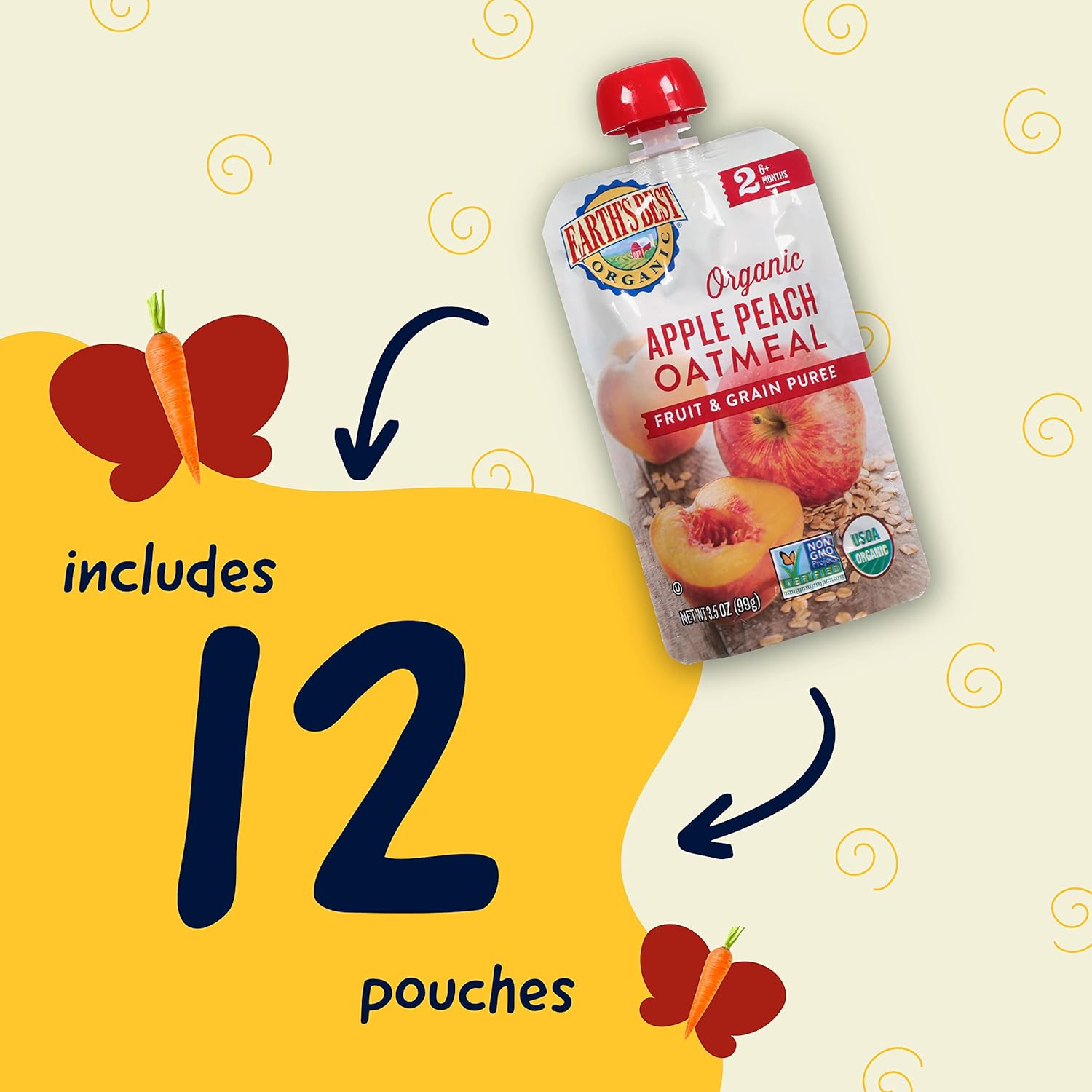 Earth’s Best Organic Baby Food Pouches, Stage 2 Fruit and Grain Puree for Babies 6 Months and Older, Organic Apple Peach and Oatmeal Puree, 3.5 oz Resealable Pouch (Pack of 12)