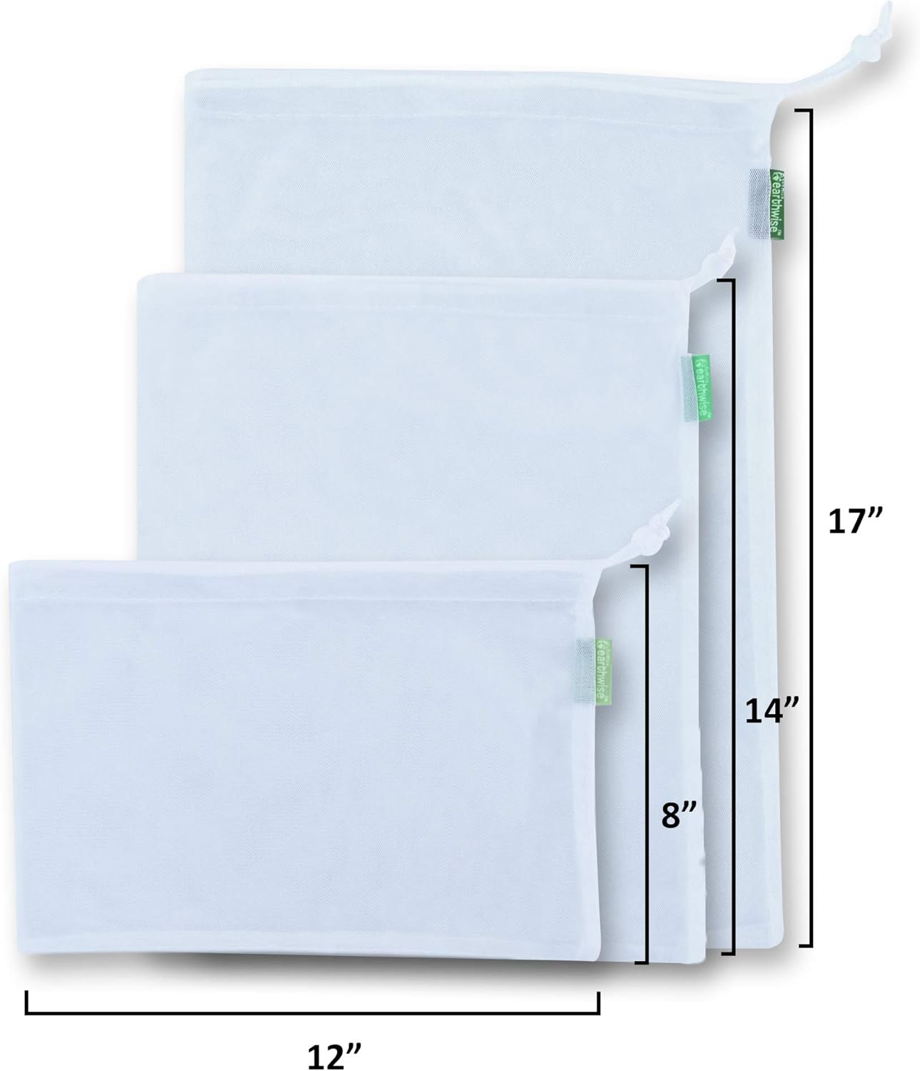 MULTI-PURPOSE & CONVENIENT: With so many different sizes, these bags are not just for produce, they also work great as TOY BAGS , SNACK BAGS, crafts storage, for picnics, washing small laundry items…they are ideal for essentially any form of organizing. VARIETY OF SIZES = VARIETY OF FOODS: With 3 different sizes these bags will accommodate most ANY SIZE FRUIT OR VEGGIE.MACHINE WASHABLE : Just throw these in the wash on gentle cycle and hang dry.