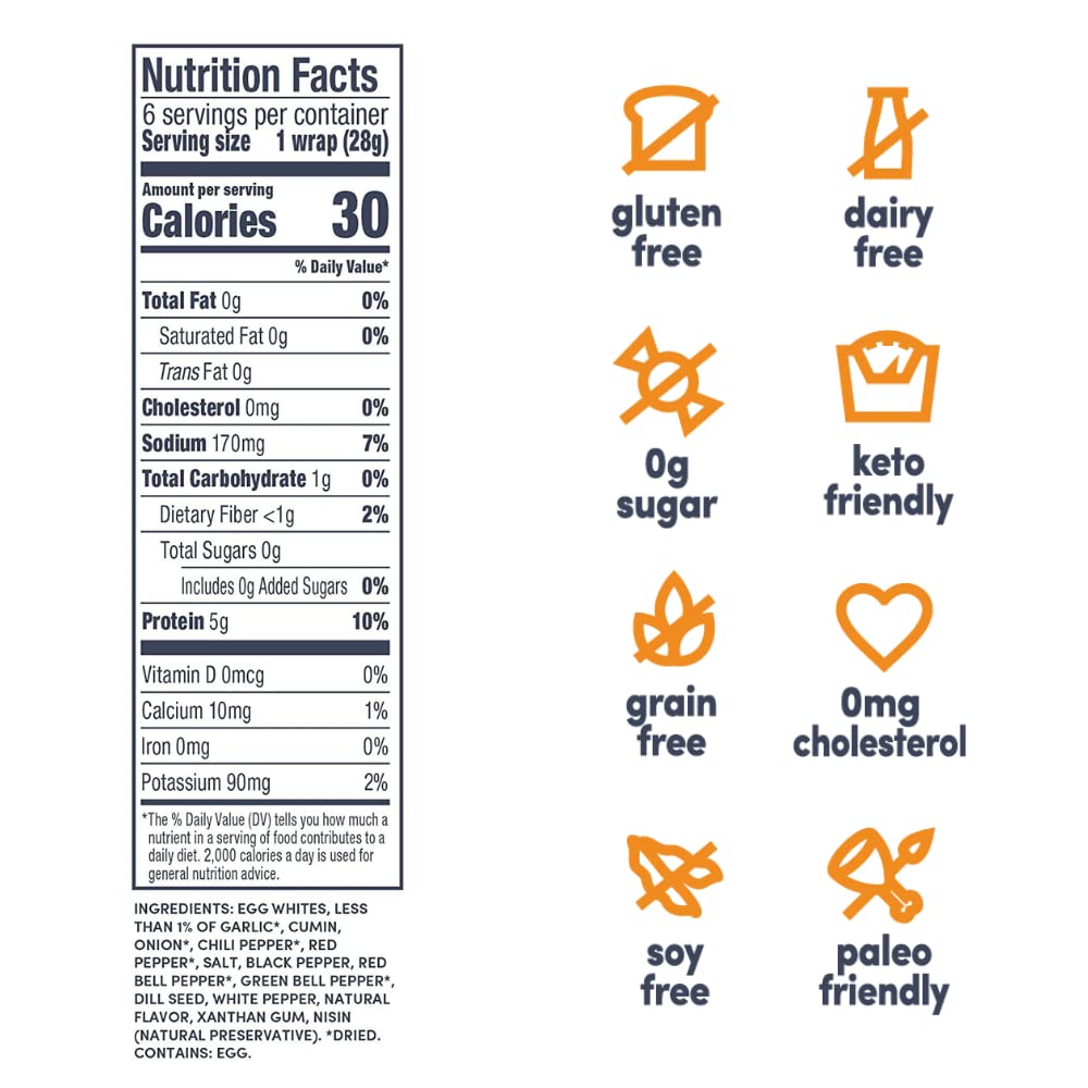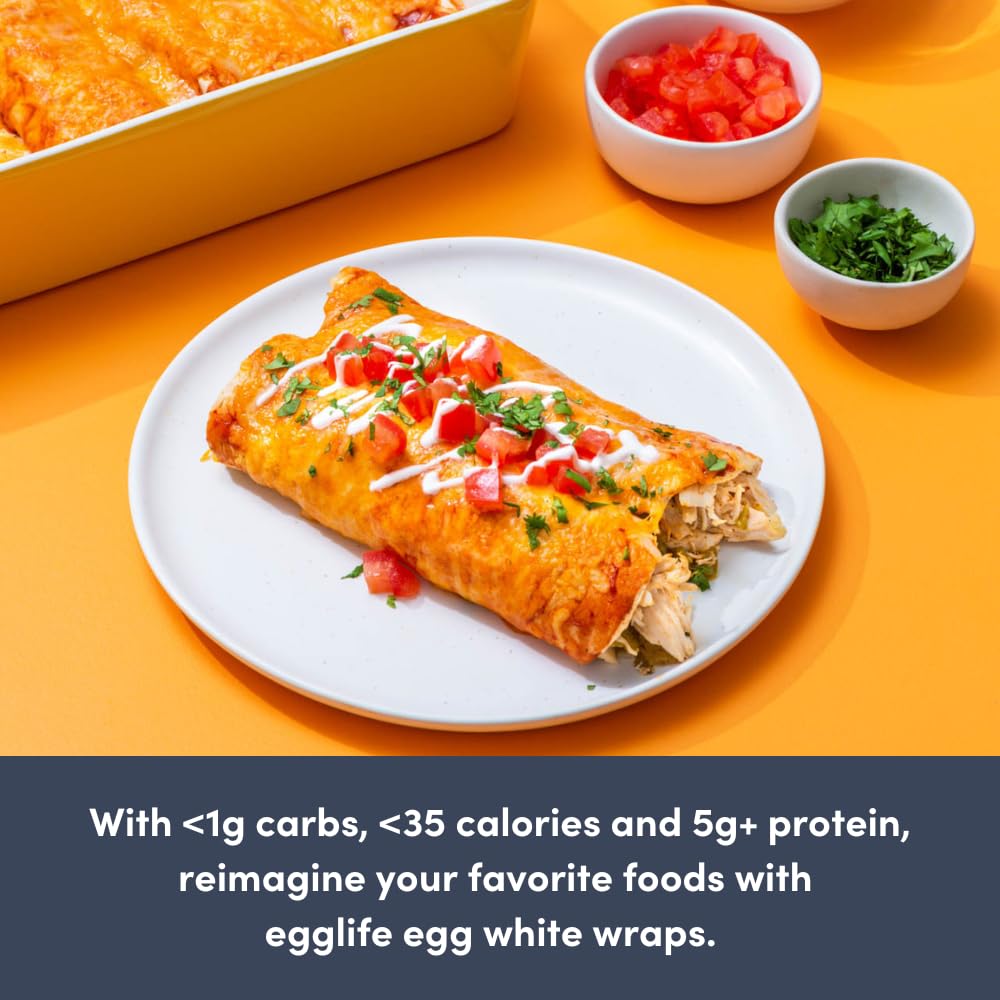 SIMPLE, DELICIOUS AND NUTRITIOUS EGG WHITE WRAPS: egglife egg white wraps are made with simple ingredients and taste delicious! With <1g carbs, <35 calories, and 5g+ protein, egglife wraps are the perfect substitute for traditional tortillas and breads that are high in carbs and processed ingredients. egglife egg white wraps are stored fresh in the refrigerator and only contain 5 ingredients!