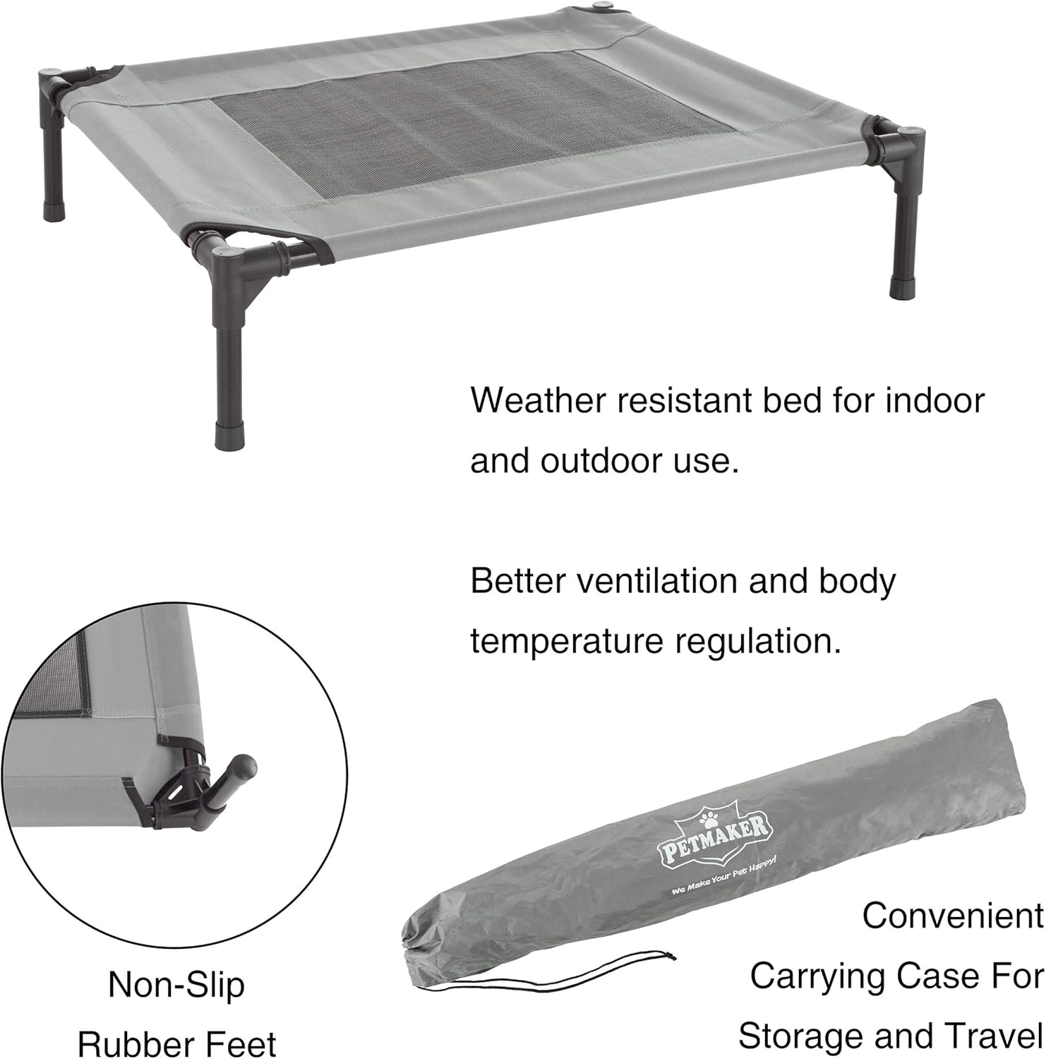 The Dog Beds for Medium Dogs by PETMAKER are a comfortable and practical sleeping solution for your furry friends. Perfect for indoor or outdoor use, this dog cot provides excellent ventilation and body temperature regulation for your pet through the large mesh panel, helping them stay relaxed and happy in both hot and cold temperatures. The lightweight and portable outdoor dog bed comes with a carrying case and sets up and breaks down in minutes so your pet can rest comfortably wherever your travels may take you. IMPORTANT: PETMAKER is committed to providing the consumer with the absolute best price and value on all of our products. NOTE: This is an exclusive product of PETMAKER and ONLY Dog Beds & Furniture by PETMAKER are GUARANTEED to be genuine. Avoid buying counterfeit products and transacting with unauthorized sellers.