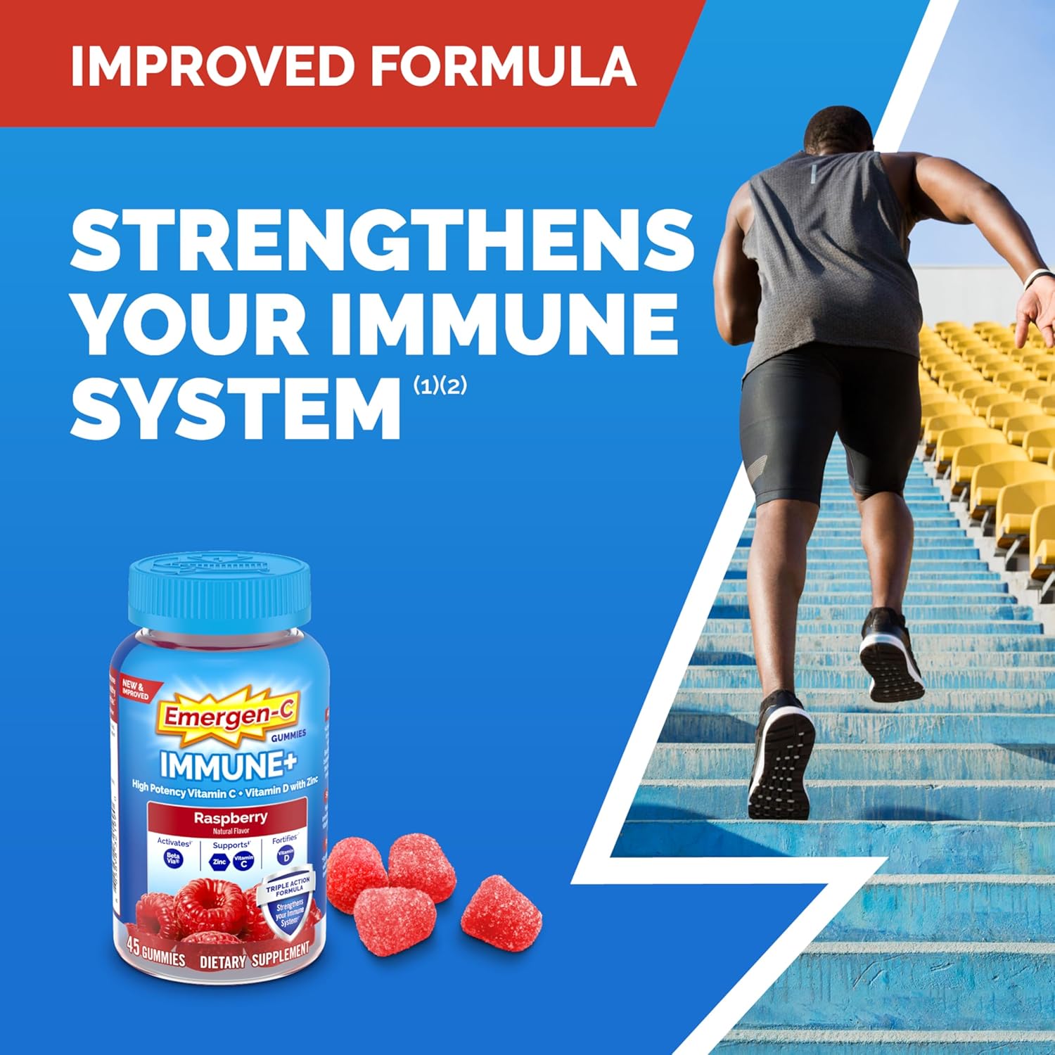 Emergen-C Immune+ Immune Gummies, Vitamin D Plus 750 mg Vitamin C, Immune Support Dietary Supplement, Caffeine Free, Gluten Free, Raspberry Flavor – 45 Count