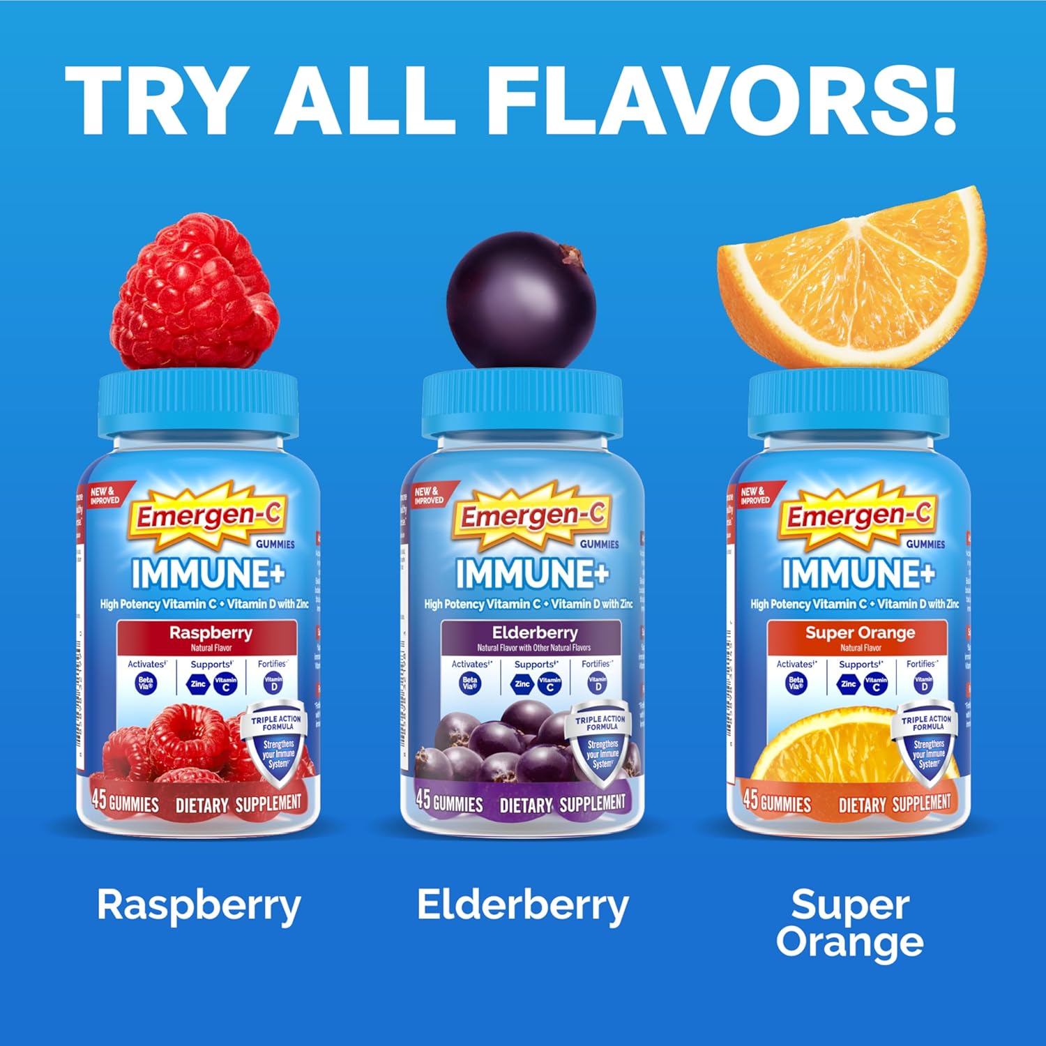 Includes 1 bottle of 45 Emergen-C Immune+ Vitamin Gummies in Raspberry flavor