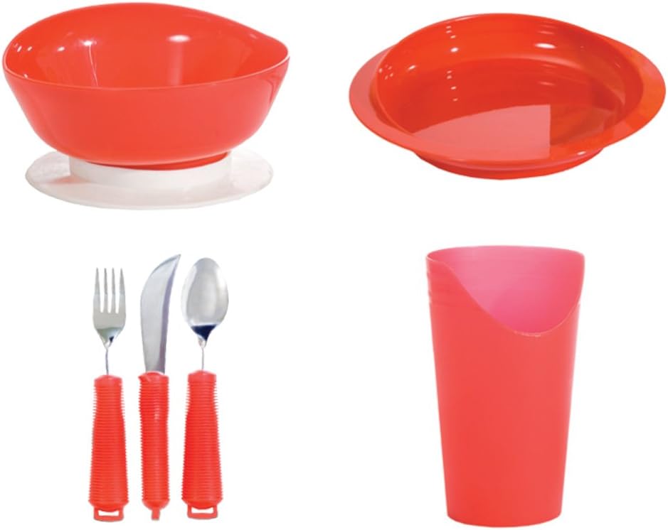 DESIGNED FOR EASE OF USE: The Essential Medical Supply Power of Red Dinnerware Set is specifically designed to make eating easier for individuals with Parkinson’s disease or other conditions that affect hand dexterity. The rimmed side and suction cup bottom of the dish and bowl allow for better control and less spills. The utensil set features large handles and features that make it easy for use. Nose cut out cup allows for drinkign without bending the neck.