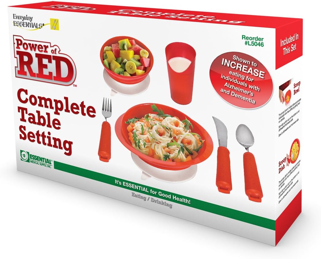 Essential Medical Supply Power of Red Dinneware Set – Includes Dish, Bowl, Utensil Set, Cup – Designed for Elderly and Senior Use Plus Users with Dementia or Rehab