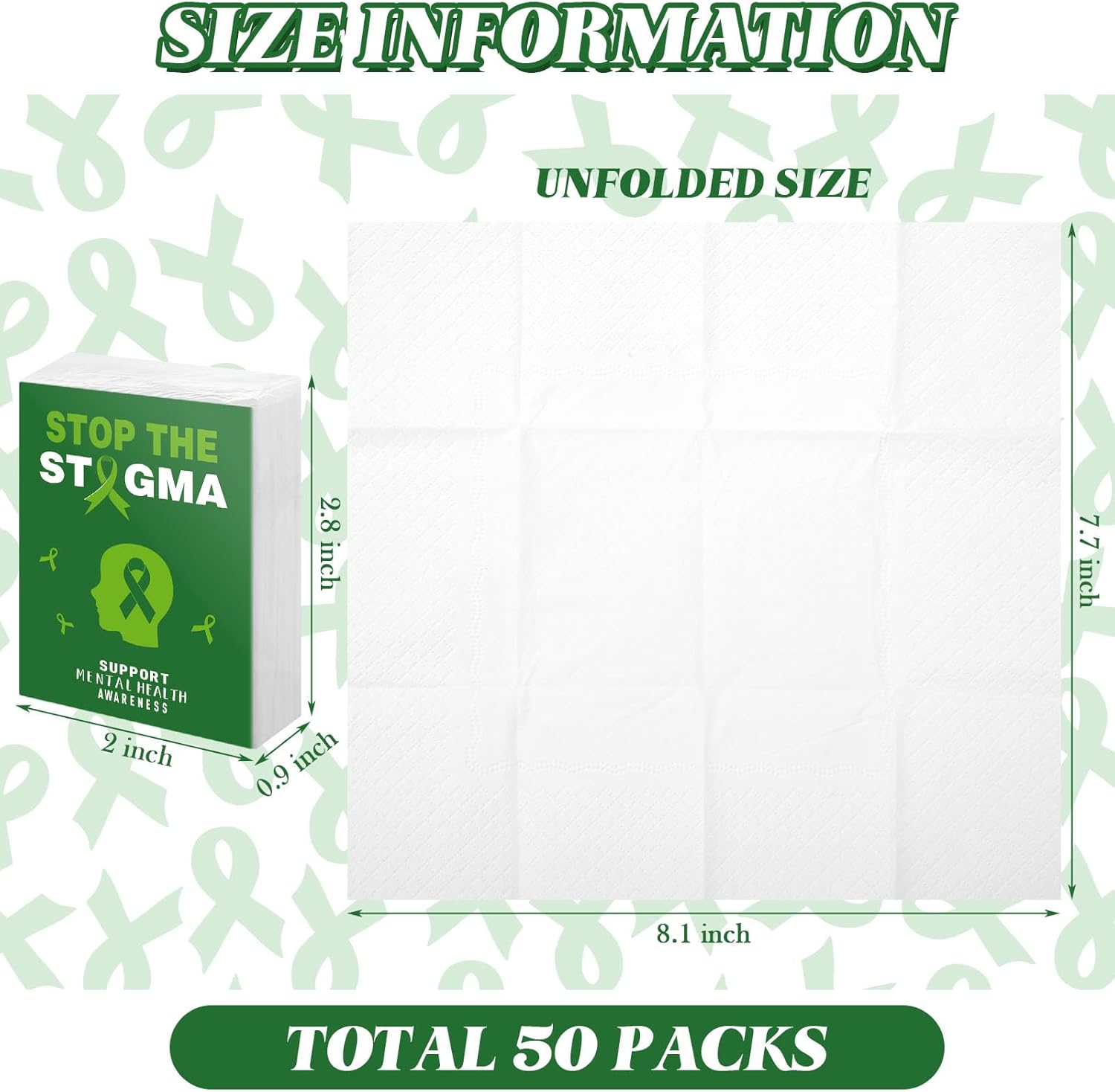 Adequate Quantity: introducing the 50 pack mental health awareness pocket tissues, the ideal way to show support for loved ones that have been affected by mental health; These green ribbon tissue paper bulk packages are not only ideal for daily use, but they make ideal mental health gift charity event favors supplies as well