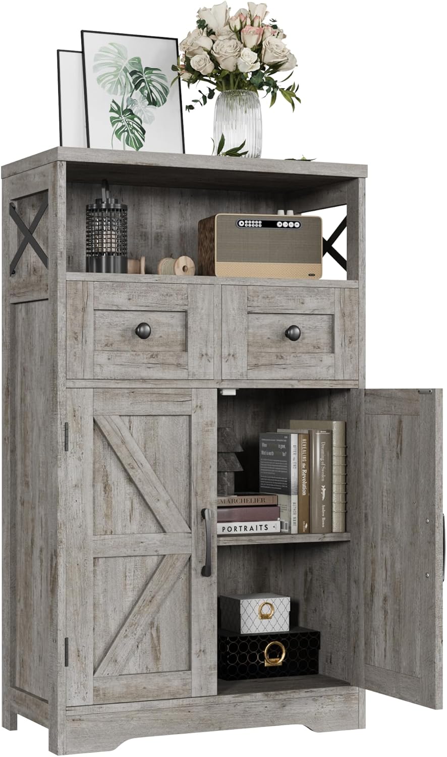 This farmhouse style storage cabinet is decorative with classic barn doors and black metal handle, brings a chic styleto your home.