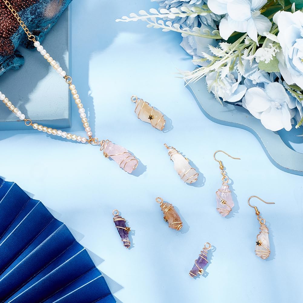 【Exquisite Appearance】: These pendants include white, purple, pink and yellow colours, each one is crystal clear, with golden wires wrapped around the outside with a star pattern, which is unique and beautiful; due to the natural gemstones, each one is different in size, shape and pattern, which makes it even more unique.