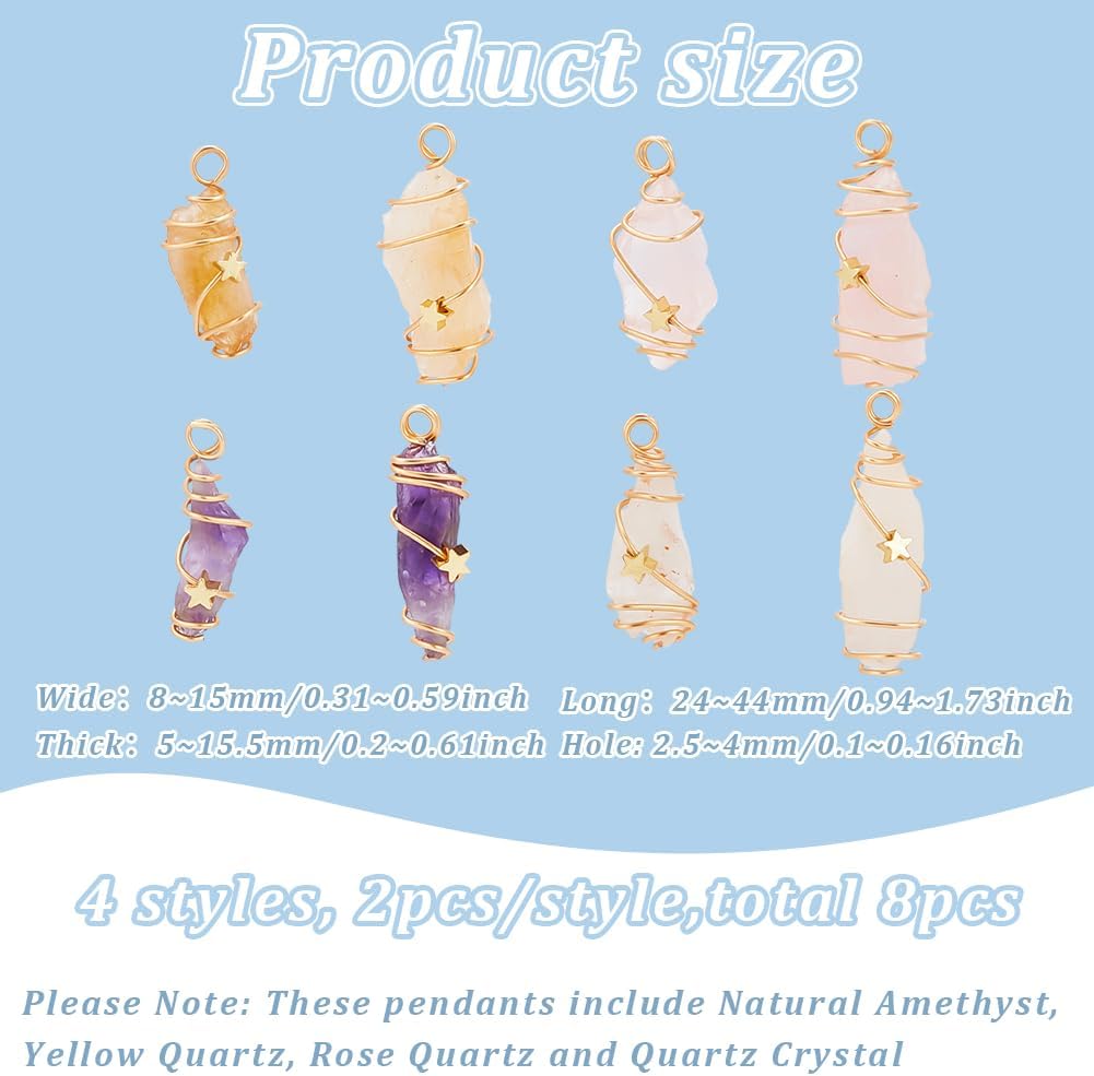 FINGERINSPIRE 8Pcs 4 Styles Natural Quartz Amethyst Stone Pendants Charms Gold Plated Wire Wrapped Crystal Gemstone Original Raw Irregular Healing Stone Charms Rough Stone Pendant for Jewelry Making