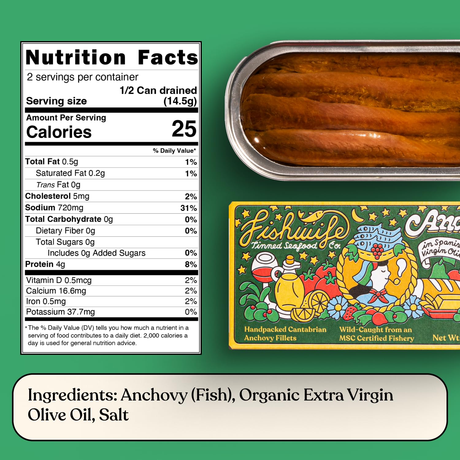 Fishwife Cantabrian Anchovies 1-Pack (1.73 Ounce) | MSC-Certified Sustainable Seafood, Gluten Free | Handpacked in BPA-Free Tins with Spanish Extra Virgin Olive Oil