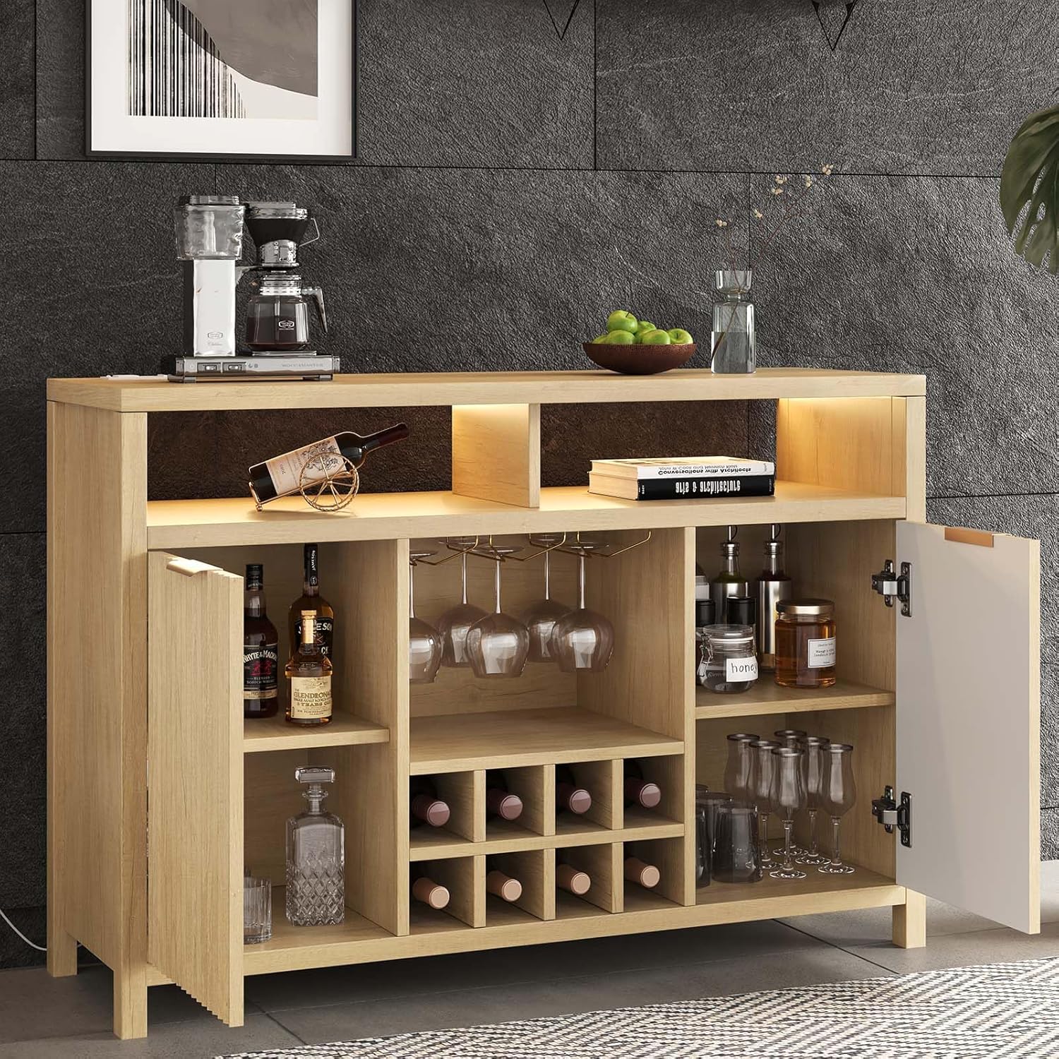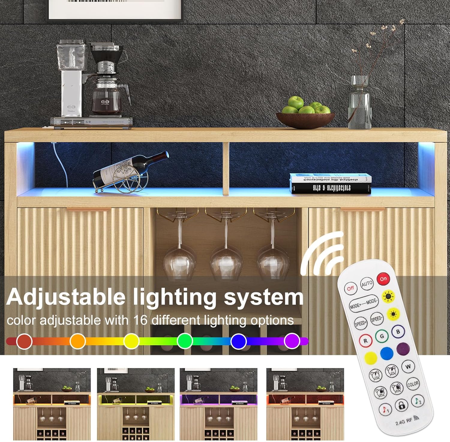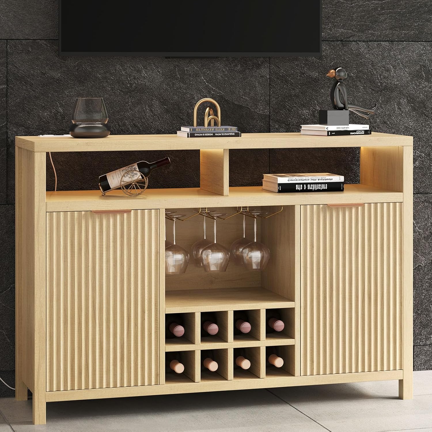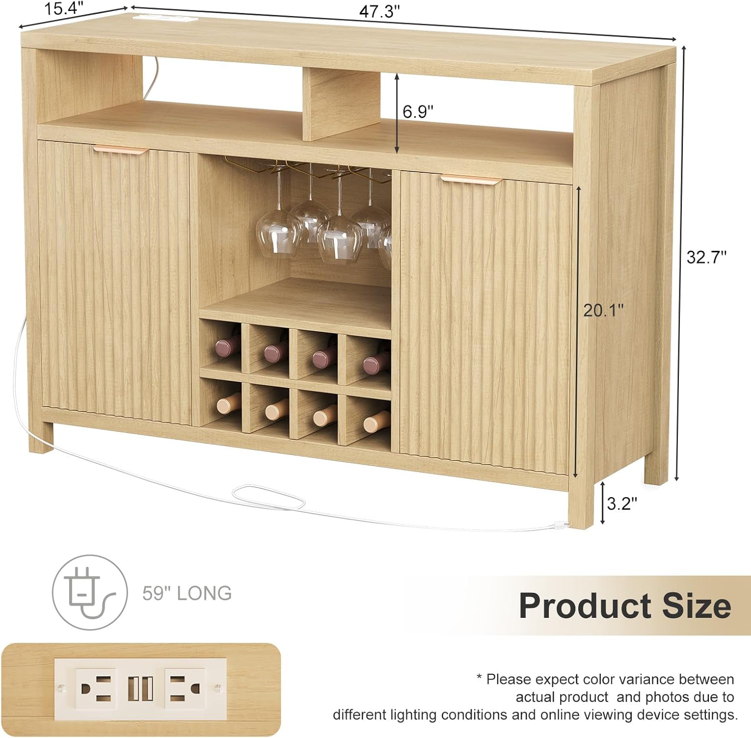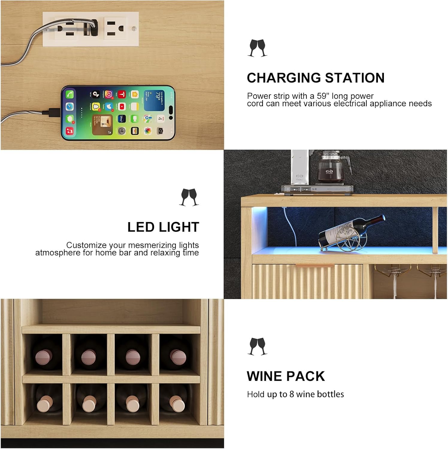 Fluted Home Bar Wine Cabinet with LED Light, Charging Station, Wine Rack – Buffet Cabinet with Storage, Coffee Bar Table, Stylish Fluted Credenza Cabinet for Modern Home Kitchen 47.2″ Oak