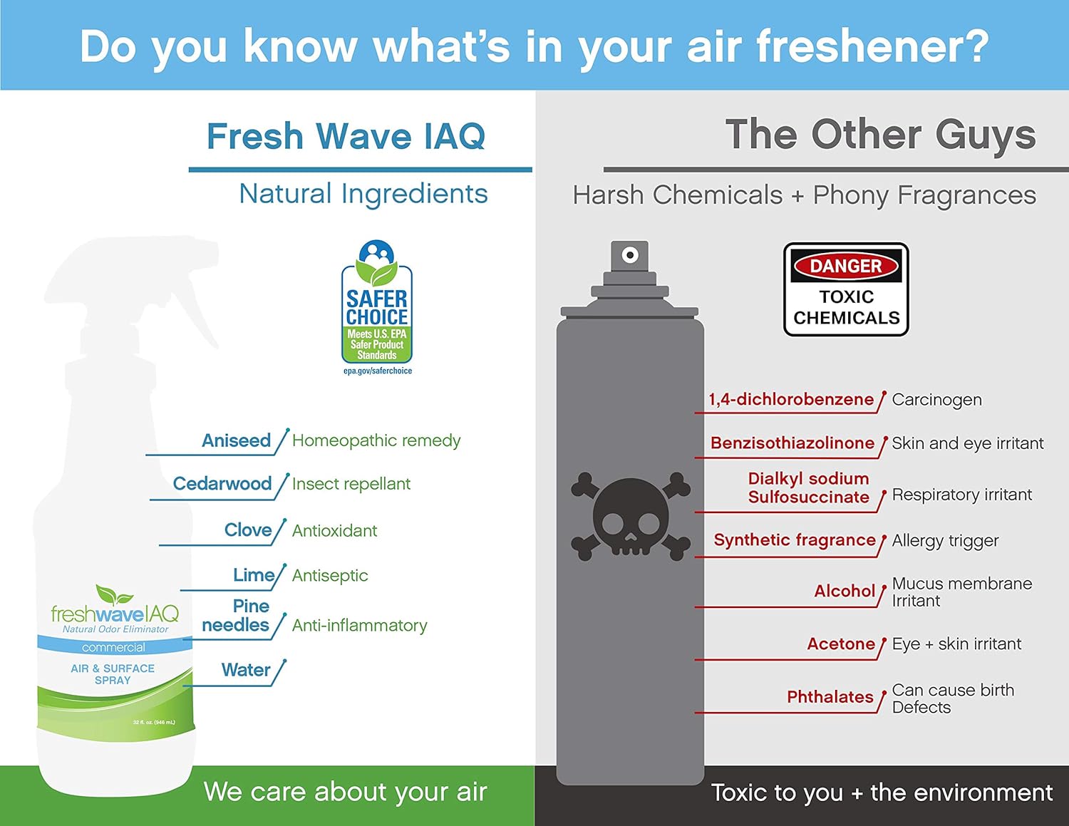 PLANT BASED ODOR ELIMINATOR: The Fresh Wave IAQ Liquid helps eliminate smells from fabrics and the air for ideal odor control at home or commercial and industrial spaces. The blend is engineered from plant oils, bio-based surfactant, and water.