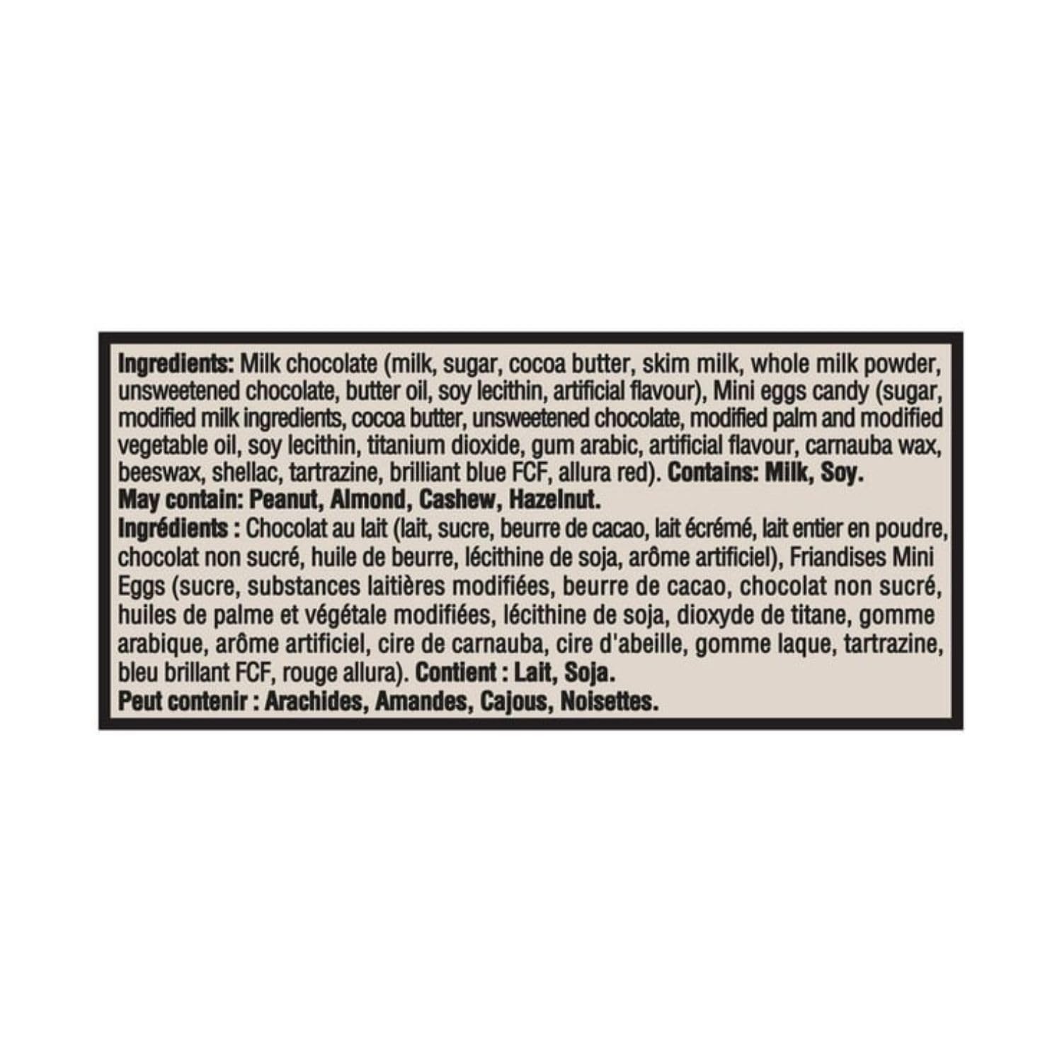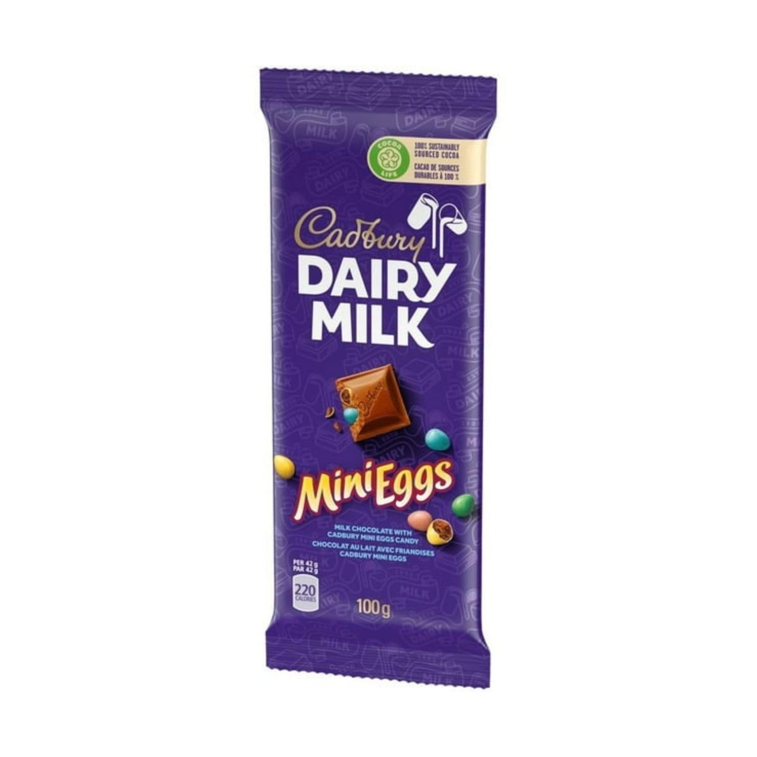 Milk chocolate with Cadbury Mini Eggs Candy. 100% sustainably sourced cocoa. Cocoa Life is our sustainable cocoa sourcing program that does good by encouraging responsible farming, and by helping fight deforestation and support cocoa farming communities. Learn more at Cocoalife.org Introducing NEW Cadbury Dairy Milk Mini Eggs – Milk chocolate with Cadbury Mini Eggs Candy Enjoy the classic, creamy taste of Cadbury Dairy Milk 100% sustainably sourced cocoa Cocoa Life is our sustainable cocoa sourcing program that does good by encouraging responsible farming, and by helping fight deforestation and support cocoa farming communities. Learn more at Cocoalife.org Tastes best when shared with a loved one Cadbury – Making chocolate and spreading goodness since 1824 For recipe ideas with Cadbury Dairy Milk visit snackworks.ca You may also like Cadbury Dairy Milk Oreo