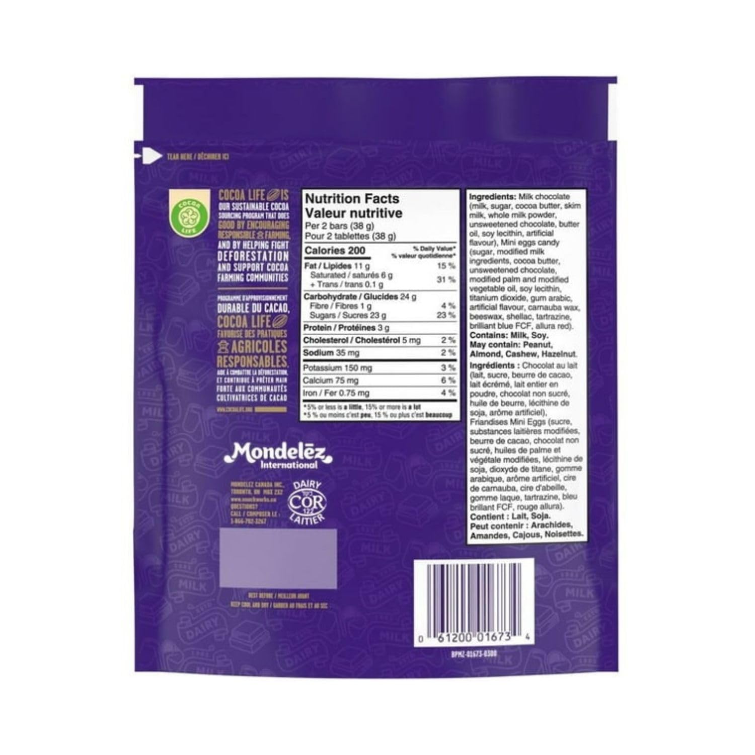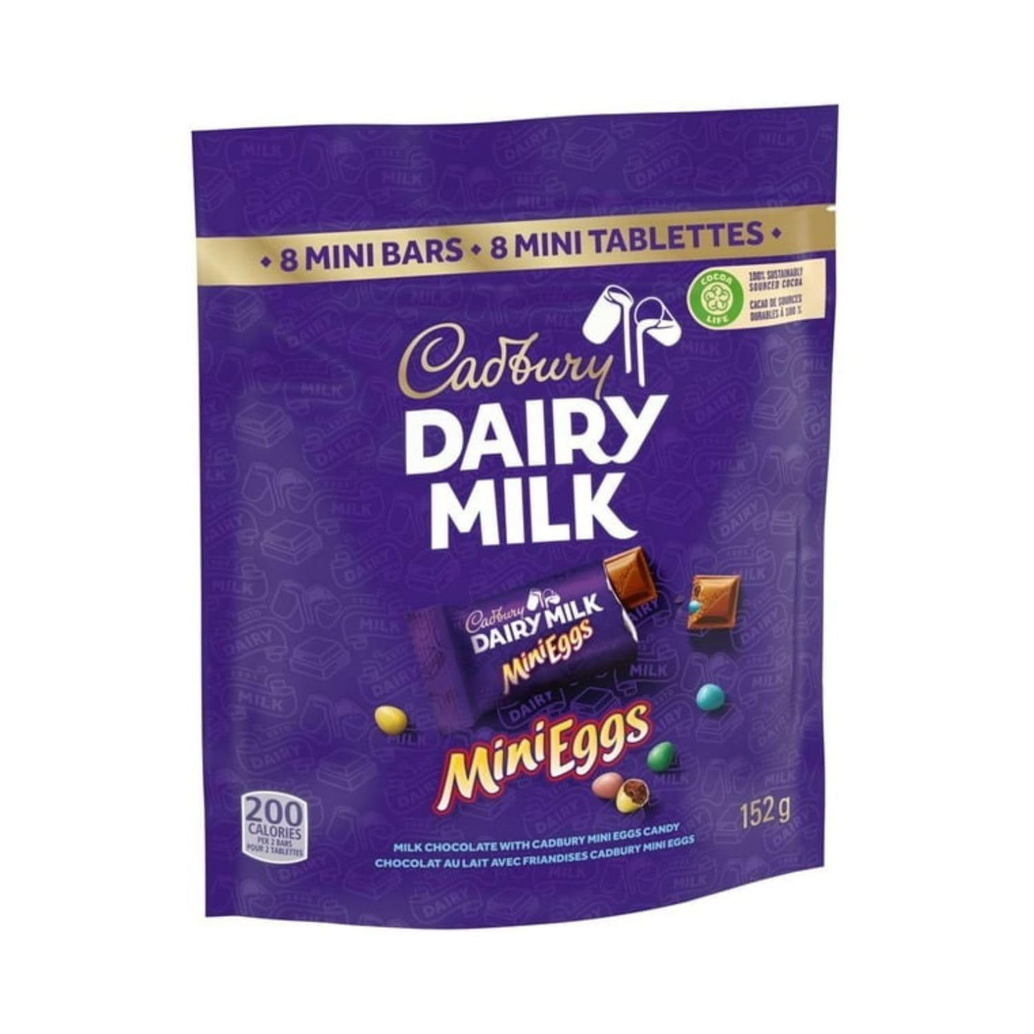 Milk chocolate with Cadbury Mini Eggs Candy. 100% sustainably sourced cocoa. Cocoa Life is our sustainable cocoa sourcing program that does good by encouraging responsible farming, and by helping fight deforestation and support cocoa farming communities. Learn more at Cocoalife.org Introducing NEW Cadbury Dairy Milk Mini Eggs – Milk chocolate with Cadbury Mini Eggs Candy Eight individually wrapped bars inside the pack. Each bar is 19gm Enjoy the classic, creamy taste of Cadbury Dairy Milk 100% sustainably sourced cocoa