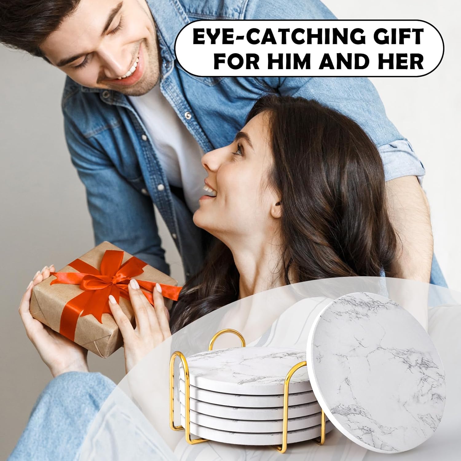 8 reviews for GOH DODD Coasters for Drinks Set of 6, Absorbent Marble Style Ceramic Coaster Set Cup Coasters Tabletop Protection Home Decor with Metal Holder for Coffee Table, White, Round, 4 Inches
