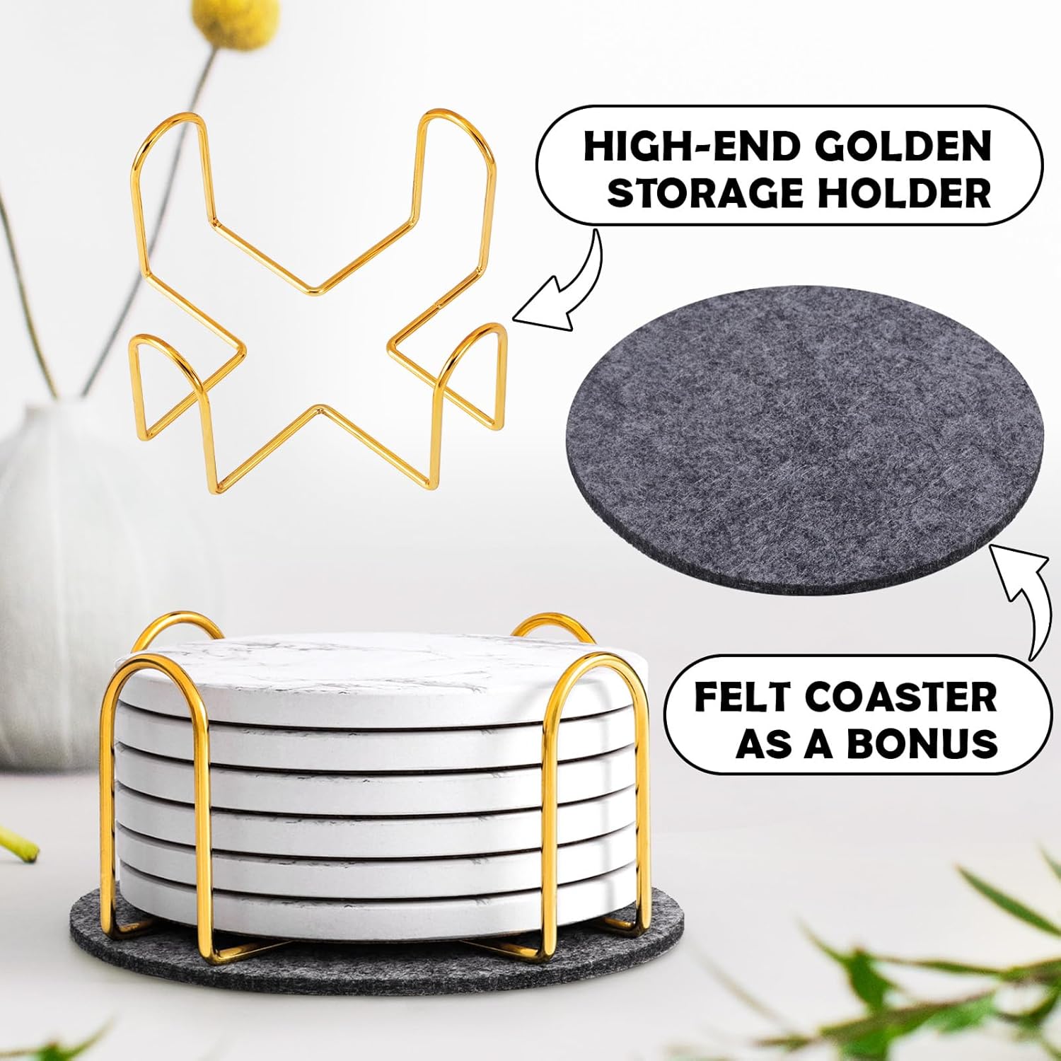GOLD METAL HOLDER INCLUDED: With a gold metal holder, it can be used to decorate the desktop, adding both beauty and practicality. Ceramic coasters can be stacked on the metal holder, saving storage space and protecting them from bumping into each other, preventing wear and tear while keeping them clean
