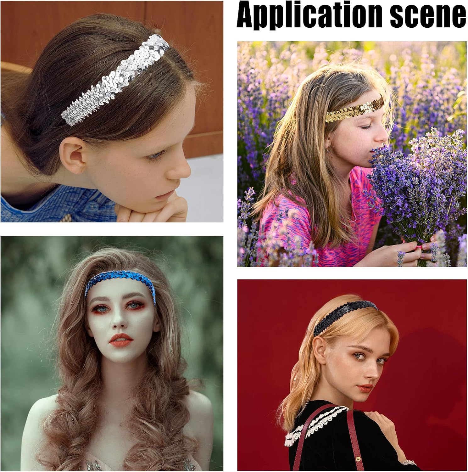 12 Pack Glitter Head Bands: Include 12 pack sequin girls headband, 1.14 inch wide, the inner diameter when unstretched is 4.6 inches/11.7cm